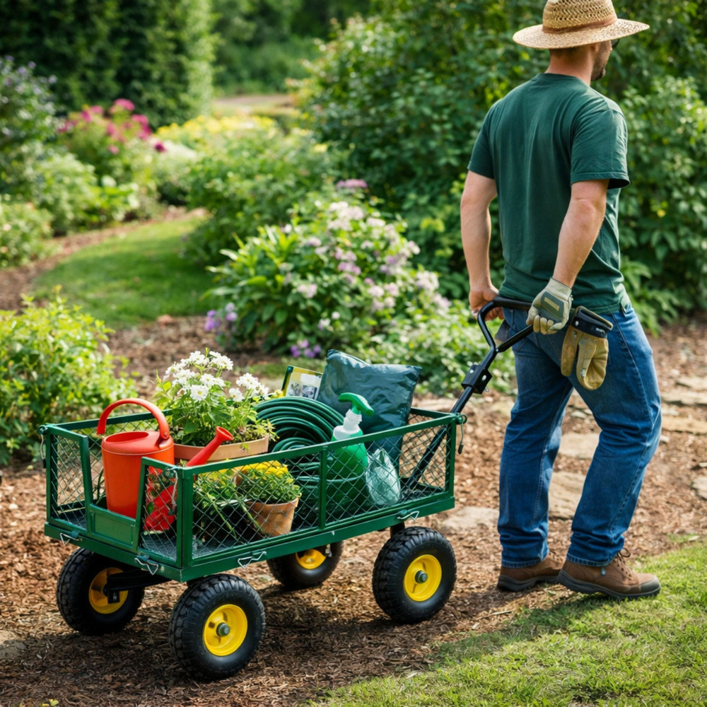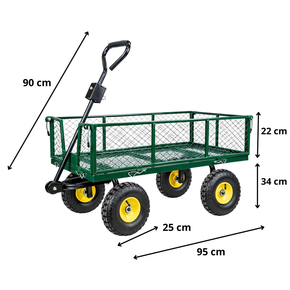 ÖSSZECSUKHATÓ ACÉL PÓTKOCSI 200 KGEz a kerti kocsi egy robusztus és funkcionális megoldás, amelyet nehéz és terjedelmes terhek kényelmes szállítására terveztek a kertben, kiskertben, farmon, műhelyben és raktárban. Tartós acélszerkezete nagy ellenállást biztosít a terheléssel, a mechanikai sérülésekkel és az időjárási viszonyokkal szemben, így ideális intenzív, mindennapi használatra. A négykerekű kialakítás garantálja a stabilitást szállítás közben, a kormányozható első tengely pedig könnyű manőverezhetőséget biztosít még teljesen megrakott állapotban is. Az acélfelnikre szerelt pneumatikus gumiabroncsok hatékonyan párnázzák az egyenetlen terepet, növelve a kényelmet fűben, kavicsban, homokban vagy térkőben végzett munka során. A nyitható oldalsó panelek jelentősen leegyszerűsítik az olyan anyagok be- és kirakodását, mint a föld, fa, kövek, szerszámok vagy építőanyag-zsákok. Az összecsukható kialakítás lehetővé teszi a kocsi gyors összecsukását használat után, így könnyen tárolható még kis helyeken is. Az ergonomikus, puha habbal borított fogantyú biztos fogást és kényelmes kormányzást biztosít, csökkentve a fáradtságot hosszabb használat során. SPECIFIKÁCIÓK: Anyag: teherbírású acélszerkezet Maximális teherbírás: kb. 200 kg Kerekek száma: 4 pneumatikus kerék Felnik: acél Kerék átmérője: 24 cm Első tengely: kormányozható Oldalak: oldalra nyíló Kialakítás: összecsukható Fogantyú: ergonomikus, habbal borított Teljes méretek: 45 x 52 x 102 cm Kosár méretei: 24 x 48 x 93 cm Rendeltetésszerű használat: kert, kiskert, műhely, raktár, építkezés A KÉSZLET TARTALMA: Kerti szállítókocsi Kerekeszett Fogantyú