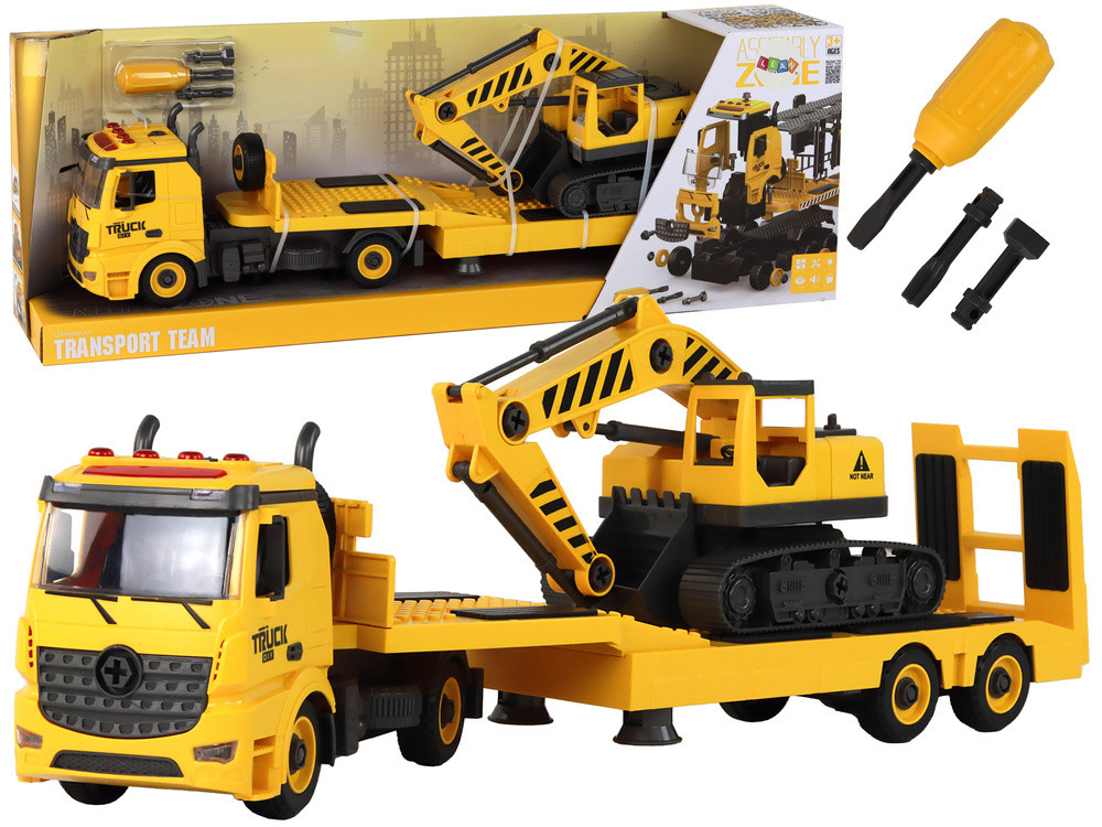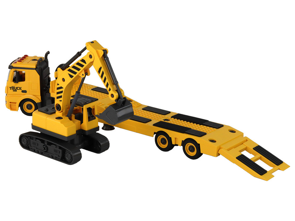 Összecsukható vontató teherautó lánctalpas kotrógéppel, hangfény, barkács, sárga
