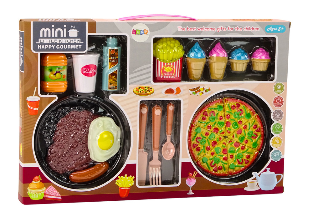 Élelmiszerkészlet Pizza Sült Krumpli Fagylalt Evőeszközök Az élelmiszerkészlet egy olyan játék, amely lehetővé teszi a gyerekek számára, hogy játékosan fedezzék fel a főzés világát. A valósághűen kidolgozott darabokból álló készlet tökéletes a kis szakácsok számára, akik imádják a finom ételek elkészítését és felszolgálását. Széles választékban tartalmaz élelmiszereket, többek között darabokra vágott pizzát, tükörtojást, szeletet, kolbászt, BBQ szószt, szívószálas italt, gyümölcslevet, sült krumplit, két fagylaltot és két muffint. Minden elem gondosan, biztonságos anyagokból készült, így biztosítva a hosszan tartó szórakozást. Ezenkívül a készlet evőeszközöket is tartalmaz, például kést, villát és kanalat, amelyek lehetővé teszik a gyerekek számára, hogy még realisztikusabban játsszák el a szerepeiket. A főzés és az étkezés felszolgálása lehetővé teszi, hogy saját forgatókönyveket és történeteket alkossanak, ami serkenti a képzeletet és fejleszti a narratív készségeket. A gyerekek megtanulják, hogyan komponáljanak ételeket, kombináljanak ízeket és kísérletezzenek különböző ételkombinációkkal. Az élelmiszerkészlet ideális játék mind egyéni, mind csoportos játékhoz. A gyerekek testvéreikkel, barátaikkal vagy szüleikkel együtt játszhatnak szakácsokat és vendégeket, ami segít fejleszteni a szociális és kommunikációs készségeiket. Az ételek közös elkészítése és felszolgálása nagyszerű módja a kapcsolatok építésének és az együttműködésnek. A darabokat gondosan úgy tervezték, hogy biztonságosak legyenek a gyermekek számára, nincsenek rajtuk éles szélek vagy apró alkatrészek, amelyek veszélyt jelenthetnek. A valósághűen kidolgozott elemek, a különféle termékek és kiegészítők, valamint a szerepjátszás lehetősége rendkívül lebilincselővé és fejlesztővé teszik a játékot. Tökéletes választás minden kis szakács számára, aki kreatív és biztonságos módon szeretné felfedezni a főzés világát. A csomag mérete: 44cm x 29cm x 4,5cm CE tanúsítvánnyal rendelkezik és megfelel az EN71 szabványnak. 3 év feletti gyermekek számára készült.
