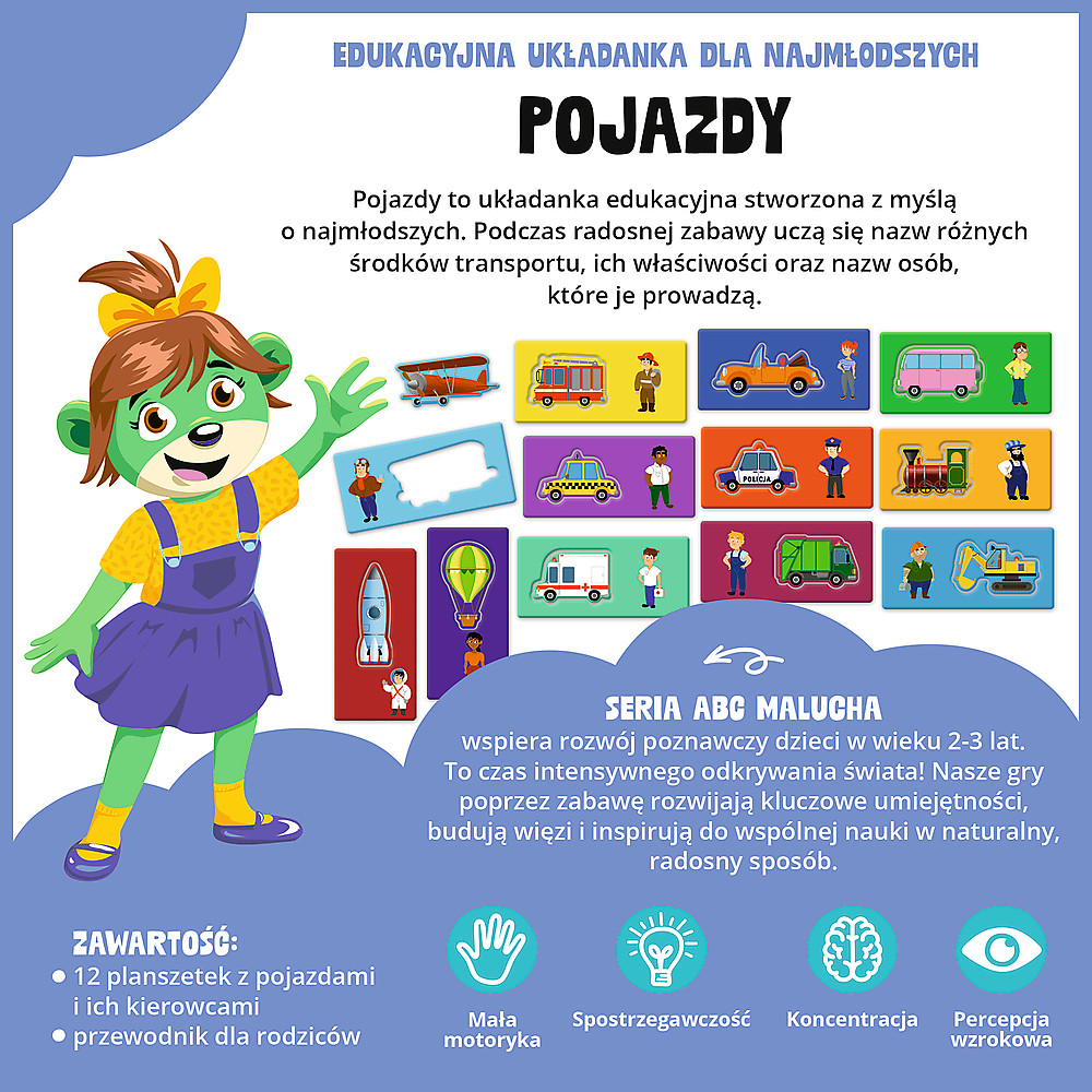 JÁTÉK - Járművek - Kisgyermek ABC - Trefl 02907 A Járművek egy oktató jellegű játék 2 éves kortól. Ez egy oktató jellegű kirakó, amely lehetővé teszi a kisgyermekek számára, hogy szórakoztató módon tanulják meg a különböző közlekedési eszközök nevét, tulajdonságaikat és az azokat üzemeltető embereket.