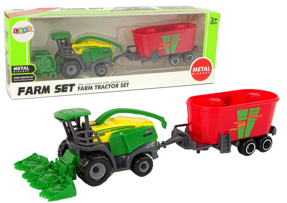 Aratógép utánfutóval Mezőgazdasági Gép Zöld Piros   Ez egy lenyűgöző játék gyerekeknek, amely lehetővé teszi számukra, hogy eljátsszák a gazdálkodó szerepét, és felfedezzék a szántóföldi munka varázsát. Lenyűgözően mutat jellegzetes zöld és sárga színében, amely az igazi mezőgazdasági gépeket tükrözi. Tartós műanyagból készült, így biztonságos és ellenáll a sérüléseknek. A jármű mozgó elemekkel van felszerelve, amelyek lehetővé teszik az interaktív és valósághű játékot. Ezenkívül a készlet tartalmaz egy piros utánfutót is, amely tökéletesen illeszkedik hozzá. Műanyag kerekekkel rendelkezik, amelyek megkönnyítik a padlón való mozgatást.   A aratógép méretei: 8 cm x 4 cm x 6 cm, így a kicsik könnyen kézben tarthatják, míg az utánfutó méretei: 9 cm x 3,5 cm x 3 cm, ami tökéletes járműtárssá teszi a virtuális szántóföldeken végzett munka során.   Ez a játék órákig tartó fantáziadús és fantáziadús játékot kínál, miközben a gyerekek az igazi gazdákat utánozzák, és felfedezik a gazdálkodás titkait. Ez nagyszerű módja annak, hogy ösztönözzük őket a mezőgazdaság világának felfedezésére és a kézügyesség fejlesztésére. Ez egy fantasztikus ajándék minden kis gazdálkodásrajongónak, aki szeretné megtanulni a munka titkait, miközben jól érzi magát, és mosolyogva szórakozik.   Készlet tartalma: - kombájn - utánfutó   Kombájn méretei: 8 cm x 4 cm x 6 cm   Utánfutó méretei: 9 cm x 3,5 cm x 3 cm   A kombájn méretei az utánfutóval: 17 cm x 4 cm x 6 cm   A csomag mérete: 21 cm x 7,5 cm x 5 cm   CE tanúsítvánnyal rendelkezik és megfelel az EN71 szabványnak. A játék 3 év feletti gyermekek számára készült.