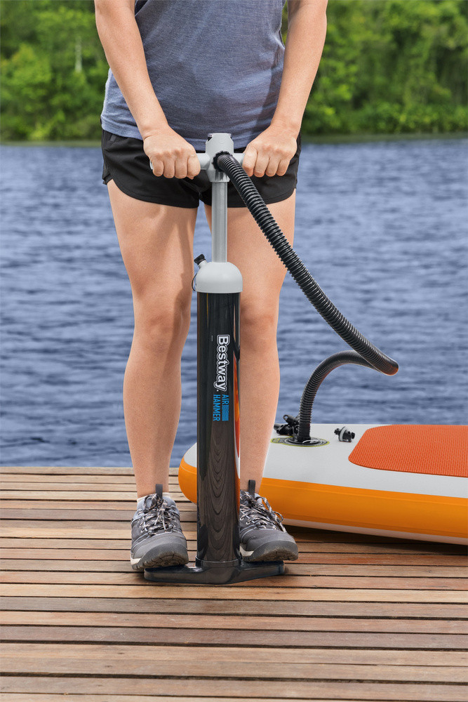 Nagynyomású kézi pumpa manométerrel Bestway 62227 A Bestway nagynyomású kézi pumpa nyomásmérővel lehetővé teszi, hogy könnyedén felfújjon matracokat, felfújható ágyakat, úszógyűrűket, pontonokat, SUP deszkákat, labdákat és egyéb tárgyakat. A pumpa alumínium dugattyúval rendelkezik. Csúszásgátló bevonatú fogantyúk. Nyomásmérő áttekinthető kijelzővel. A készlet 5 különböző adaptert tartalmaz.   Műszaki adatok: - Méretek: 25x10,5x65 cm - Lökettérfogat: 1,8 l/ciklus (egyirányú), 3,45 l/ciklus (kétirányú) - Adapterek száma: 5 - A pumpa a legtöbb felfújható tárgyhoz alkalmas, 5-23 PSI üzemi nyomással - Funkció: felfújás, leeresztés - Beépített nyomásérzékelővel ellátott kijelző - Rugalmas tömlő   A csomag mérete: 26 cm x 11 cm x 65 cm