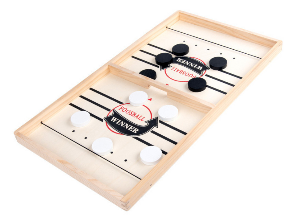 Fa léghoki katapult játék 36 cm-es fa hoki játék. A hoki játék tökéletes szórakozást nyújt minden korosztály számára, amely biztosan leköti a fiatalabb és idősebb résztvevőket egyaránt. Ez a léghoki stílusú asztali mini hoki nagyszerű szórakozás családi összejövetelekre, bulikra és egyéb alkalmakra, amelyek felejthetetlen érzelmeket nyújtanak. A játék célja az összes korong eltalálása az ellenfél pályáján, ami nemcsak figyelmet, hanem precíz pontosságot is igényel. A hoki nagyszerű edzés a motoros koordinációra és a türelemre, és egyszerűségének és dinamikájának köszönhetően a játék nem unalmassá válik gyorsan. A készlet tartós fából készült, ami környezetbarát és biztonságos a gyermekek számára. A tábla és a korongok masszívak, kiküszöbölve a műanyag használata során fellépő sérülésveszélyt. A tábla kompakt méretei miatt a mini hoki elég kicsi ahhoz, hogy használaton kívül könnyen tárolható legyen. Nem foglal sok helyet, ami megkönnyíti a szoba rendben tartását. Specifikáció: anyag - fa, játékosok száma - 2, korongok száma - 5 darab. A hoki játék egy interaktív játék, amely örömet és izgalmat nyújt a közös versenyzés során! A játék méretei: 36cm x 23cm x 3cm. CE minősítésű, és megfelel az EN71 szabványnak. 3 év feletti gyermekek számára tervezték.