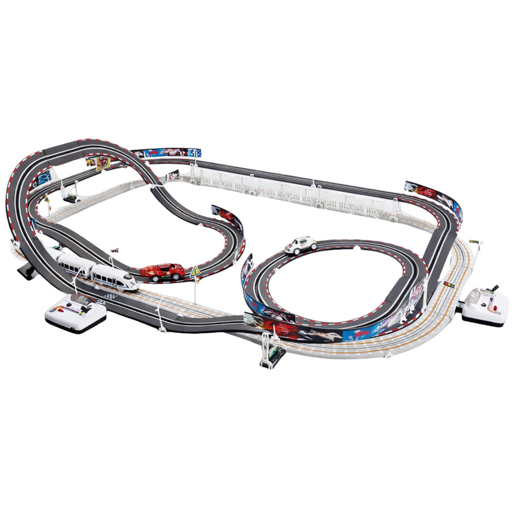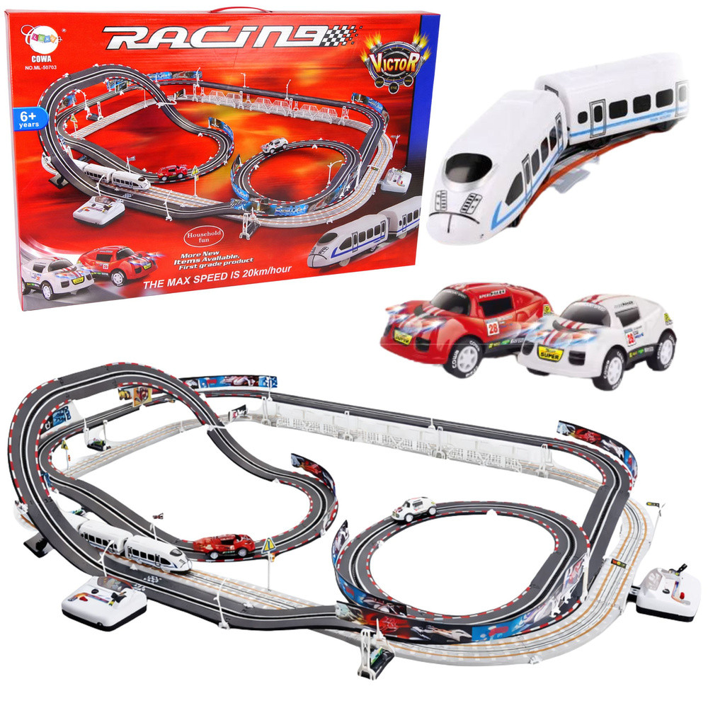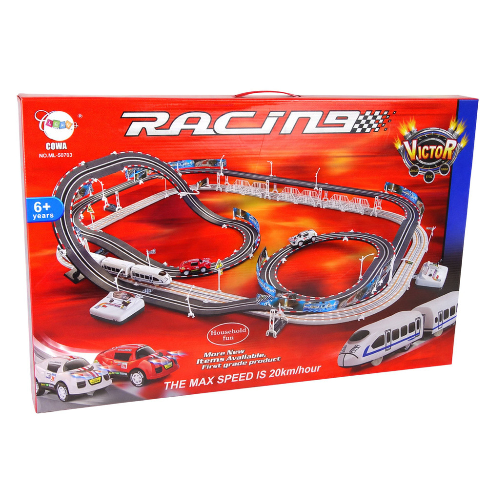 Hatalmas Versenypálya Készlet Autópálya + Elektromos Vonatpálya  Egy dupla versenypálya, melynek építőelemei lehetővé teszik éles kanyarokkal, szerpentinekkel és egyenes szakaszokkal ellátott pálya építését, mindezt a szórakozás maximalizálása érdekében. Az autók akár 20 km/h sebességet is elérhetnek! A készlet 2 ütközésmentes kereszteződéssel és 2 hurokkal rendelkezik. Ennek köszönhetően az autó és a vonat balesetmentesen mozoghat a síneken. A távirányítók ergonomikus kialakításúak, így tökéletesen illeszkednek a gyermekek kezébe, így játék közben sem csúsznak ki a kezükből. A készlet 4 db AA elemmel működik (nem tartozék).   A készlet méretei: - Versenypálya kb. 118 cm x 77 cm. - Hurok magassága kb. 23 cm és 12 cm. - Pálya magassága kb. 7,5 cm. - Autó mérete kb. 8 cm x 4 cm x 3,5 cm. - Vasút mérete kb. 45 cm x 3,5 cm x 3,5 cm (2 kocsi kb. 11 cm, 2 kocsi 8,5 cm). - A doboz méretei kb. 72 cm x 47 cm x 5,5 cm. A készlet tartalma: - sportkocsi, - vonat, - két távirányító (egy a vonathoz és egy az autóhoz), - közlekedési táblák, - lámpák/közlekedési lámpák, - jelző- és lámpatartók, - biztonsági korlátok, - oszlopok, - 7 matrica, - 28 darab sín. 6 év feletti gyermekek számára alkalmas. Mindez elegáns kartondobozban csomagolva, ideális ajándékötlet!
