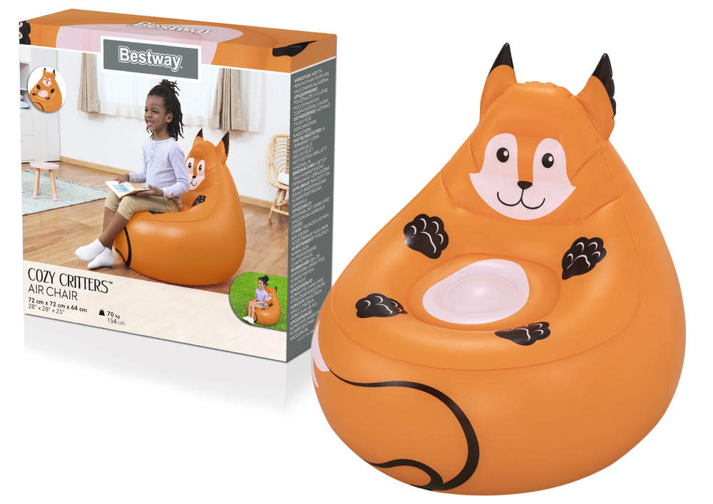Felfújható Fotel Fox 72 x 72 x 64 cm Bestway 75116  A felfújható szék könnyen felállítható, minimális helyet igényel és szuper kényelmes. Masszív szerkezetének és tágas felületének köszönhetően ez a szék tökéletes gyermeke szobájába. A szék kialakítása maximális kényelmet biztosít, akár fekve, nyújtózkodva, akár egyenesen ülve dolgozik. A brokáttal töltött fotel biztosan vonzza a legkisebbek tekintetét. Ezenkívül beltéri és kültéri használatra is tökéletes. Főbb jellemzők: - Méretek 72 x 72 x 64 cm - gyors légtelenítő szelep - Érdekes grafika - Maximális terhelhetőség: 70 kg - javítófolt a készletben - kültéri és beltéri használatra Súly: 1,2 kg A csomag mérete: 24cm x 25cm x 6cm