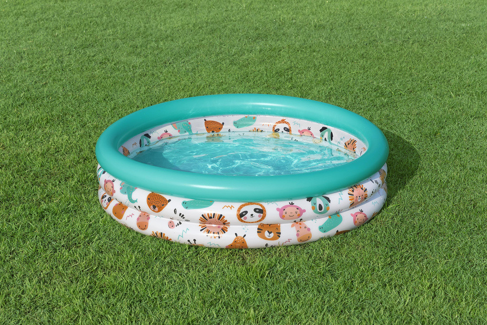 Felfújható kerti medence gyerekeknek állatokkal 102 cm Bestway 51008Egy megbízható medence gyermekei számára, amely tökéletes módja lesz a nyári kikapcsolódásnak. Könnyű, így könnyen áthelyezheti az Önnek legmegfelelőbb helyre, ahol gyermekei gondtalanul élvezhetik a napsugarakat és felejthetetlen szórakozásban lehet részük. A medence alacsony magassága és felülete garantálja, hogy a víz gyorsan felmelegszik a napsugarak hatására, így a gyerekeknek nem kell sokáig várniuk a játékra.Főbb jellemzők:- három felfújható gyűrű- puha felfújható falak- puha aljMűszaki adatok:- méretek 102 cm x 24 cm- PVC anyag- medence űrtartalma 100 liter- ajánlott életkor 2 éves kortól- ajánlott vízmennyiség: 80%Mérleg: 1 kgA csomag mérete: 28 cm x 24 cm x 5 cm