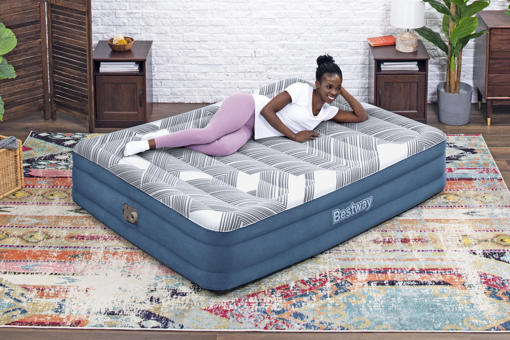 Felfújható matrac 203 x 152 x 36 cm Bestway 6712Y Ez a matrac tökéletes megoldás azoknak, akik kényelmes és praktikus alvási helyet keresnek otthon és utazás közben is. Masszív felépítésének és praktikus megoldásainak köszönhetően jól használható pótágyként vendégek számára, valamint kempingezés vagy utazás során. A beépített elektromos pumpa lehetővé teszi a matrac gyors és egyszerű felfújását további tartozékok nélkül. Műszaki adatok: Méretek: 203 x 152 x 36 cm Anyag: PVC, velúr Rendeltetésszerű használat: két személy Felfújási idő: 4 perc Szivattyú tápellátása 220 - 240 V Készlet tartalma: -matrac - beépített pumpa - hordtáska - javítókészlet Csomag súlya: 8 kg