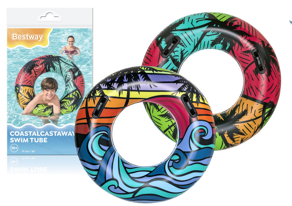 Felfújható úszógyűrű 91 cm Bestway 36350Ez az úszógyűrű garantáltan remek szórakozást nyújt a nyári napokon! Tartós PVC-ből készült, így könnyedén kezeli még a legenergikusabb szórakozást is. Két masszív fogantyú biztosítja a termék további stabilitását és kényelmét használat közben. A gyűrű 10 év feletti gyermekek számára készült. Könnyen felfújható és összecsukva kompakt - ideális strandra, úszómedencébe vagy nyaraláshoz.Főbb jellemzők:- átmérő 91 cm- 10 év feletti gyermekek számára készült- két masszív fogantyúSúly: 0,30 kg