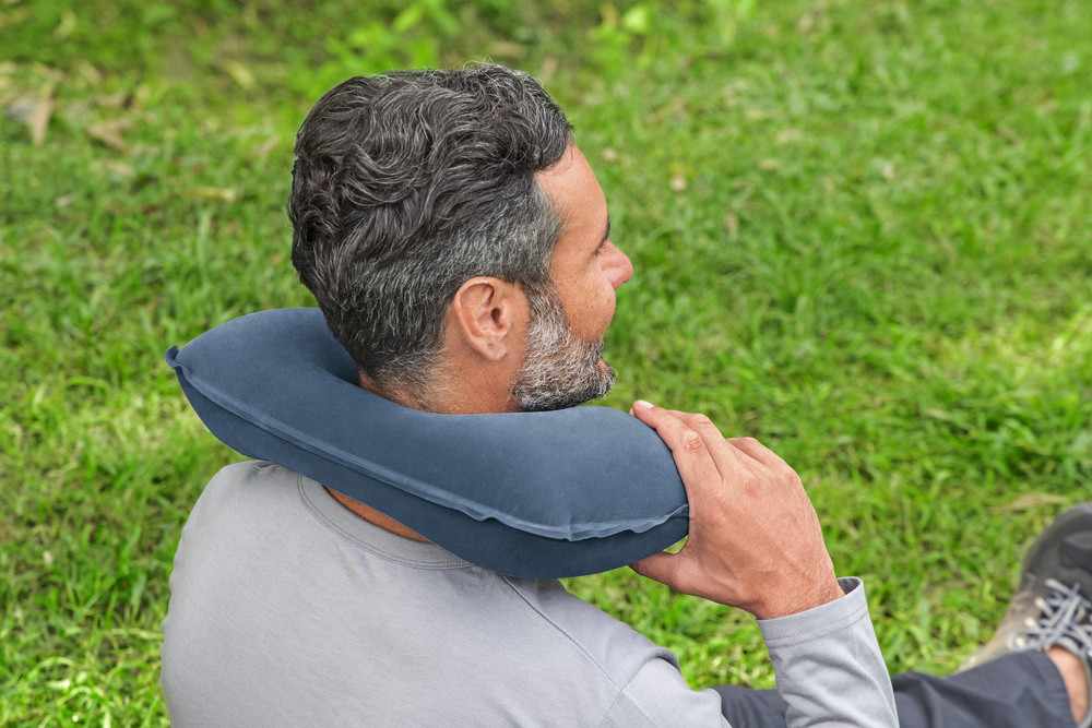 Felfújható utazópárna Croissant Kék Bestway 67006 A felfújható párna tökéletes társ bármilyen utazáshoz - a hosszú repülőutakon, vonatozáson át a tengerparti pihenésig. A croissant ergonomikus formájának köszönhetően stabil támaszt nyújt a nyaknak és a fejnek, ami jelentősen növeli a kényelmet ülő helyzetben. A párna könnyű és kompakt - leeresztés után könnyen elfér a zsebben vagy a kézipoggyászban. Felfújásához nem kell pumpa, így rendkívül praktikus utazás közben. Ezenkívül a bolyhosított felület kellemes érzetet biztosít használat közben, a tartós anyag pedig hosszú távú használatot garantál. Műszaki adatok: - méretek 46 cm x 28 cm - ergonomikus forma, amely alkalmazkodik a nyakhoz - anyag PVC Velúr Csomag súlya: 0,11 kg Csomag méretei: 12 cm x 4 cm x 7 cm