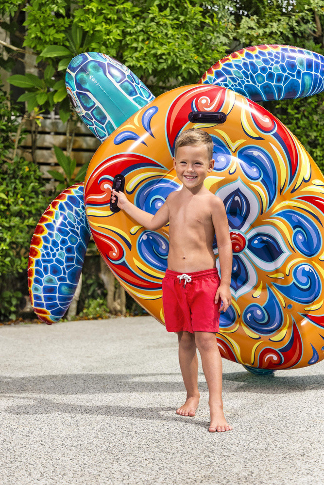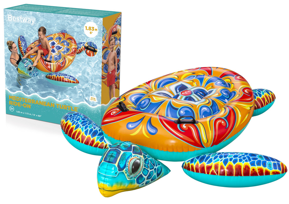 Felfújható Teknős Matrac 183 x 173 cm Bestway 41523Készülj fel a nyári szórakozásra, amely gyerekeket és felnőtteket egyaránt elkápráztat! A Bestway felfújható teknős alakú matraca nemcsak kényelmes hely a kikapcsolódásra, hanem lenyűgöző látványosság is, amely kiemeli majd a vízpartot. A színes majolika minta és a valósághű teknős alak szemet gyönyörködtetővé teszi a matracot, és játékra ösztönöz.Két masszív fogantyújának és könnyű szerkezetének köszönhetően a matrac könnyen hordozható, és használat közben stabilitást biztosít. Tökéletes napozáshoz, úszáshoz a tavon vagy vízi szórakozáshoz a medencében.Műszaki adatok:- PVC anyag- maximális terhelhetőség 85 kg- fogantyúk- 3 év feletti gyermekek számára készült- javítófoltCsomag méretei: 30 cm x 30 cm x 9 cm