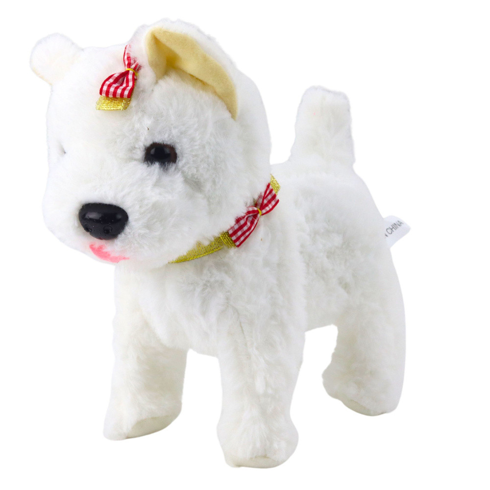 Interaktív kutya íjakkal pórázon sétál és fehéren ugat