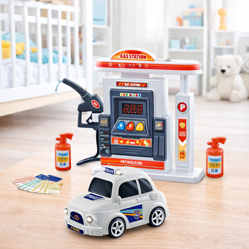 INTERAKTÍV BENZINKÚT AUTÓVAL, HANGHATÁSOKKAL, FÉNYEKKEL ÉS SZÓRÓVELEz az interaktív, autós benzinkút egy valósághű játékkészlet járművek tankolásához és vezetéséhez, lehetővé téve a gyerekek számára, hogy mindennapi jeleneteket játsszanak el. A játék szimulálja az üzemanyag- és víztöltés folyamatát, lehetővé téve a gyerekek számára, hogy sofőr vagy benzinkutas szerepét játsszák el. A tematikus játék fény- és hanghatásokkal való kombinációja fokozza a készlet realizmusát és vonzerejét. A kút numerikus kijelzővel, funkciógombokkal és hanghatásokkal rendelkezik, amelyek szimulálják az üzemanyagtöltést. Egy pisztollyal ellátott tömlő lehetővé teszi a jármű feltöltését, egy speciális tartály pedig a vízpermet funkciót. Az autó fényhatásokkal és szórónyílással van felszerelve, ami tovább fokozza a szórakozást. A készlet tartalmaz egy álpénzt és egy kártyát is, amellyel a gyerekek szimulálhatják az üzemanyagfizetést. Ez a játékkészlet fejleszti a képzelőerőt, a szociális készségeket és a kéz-szem koordinációt. SPECIFIKÁCIÓK: Terméktípus: Interaktív benzinkút autóval Jellemzők: Hanghatások, fényhatások, digitális kijelző, vízpermet funkció Szimuláció: Tankolás és fizetés kártyával vagy készpénzzel Tápellátás: 6 x 1,5 V-os AA elem (nem tartozék) Anyag: Műanyag Csomag méretei: 31,5 x 26 x 10 cm A KÉSZLET TARTALMA: Benzinkút pumpával Rendőrautó Tömlő üzemanyagpisztollyal Hamis bankjegyek Készpénzkártya További tartozékok Lásd a csomagolást
