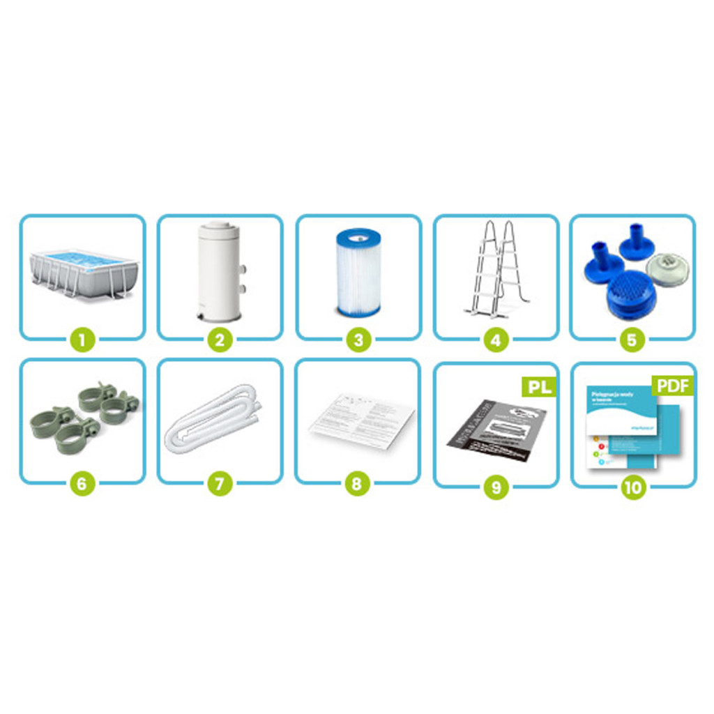 Keretes kerti medence 400 x 200 x 100 cm 10IN1 SZETT INTEX 26788 HIT új design!!! Kész készlet – nem kell minden elemet magának keresnie. Dedikált kiegészítőkkel ellátott INTEX medence vásárlásakor biztos lehet benne, hogy a legjobb minőséget kapja, és minden passzolni fog. A KÉSZLET TARTALMA Keretes medence 400 x 200 x 100 cm Szűrőszivattyú Szivattyúszűrő Biztonságos fém létra Szivattyúszűrők Szivattyú csatlakozások Szivattyútömlők Javítási folt Lengyel nyelvű utasítások Útmutató – letölthető az aukción Először is: gyermekbiztonság A leszerelhető lépcsők megakadályozzák, hogy felügyelet nélkül hagyott gyerekek lépjenek be Magassága tökéletesen illeszkedik a medence méretéhez Korrózióálló, megerősített fémkeret Csúszásgátló lépcsők Kényelmes kapaszkodók Másodszor: a legmagasabb minőségi kidolgozás Tartós 3 rétegű PVC anyag Nylon hálós megerősítés a rétegek között Szúrásálló bevonat Fehér és kék mozaikot imitáló belső tér A medence 3 gyors lépésben készen áll: Bontsa ki a héjat, Szerelje össze a keretet – nincs szükség szerszámra Felöntjük vízzel és kész! Most egy ilyen nagy medence felállítása csak néhány pillanatot vesz igénybe! MŰSZAKI ADATOK Úszómedence A medence méretei 400 x 200 x 100 cm Medence súlya 68,9 kg Javasolt vízfeltöltés 90% Űrtartalma 6836 liter Szivattyú A szivattyú teljesítménye 2006 liter/óra Szivattyú tápellátása 220 - 240 V A típusú szűrő ️️️ Legyen csodálatos élményekkel ez a nyár! ️️️