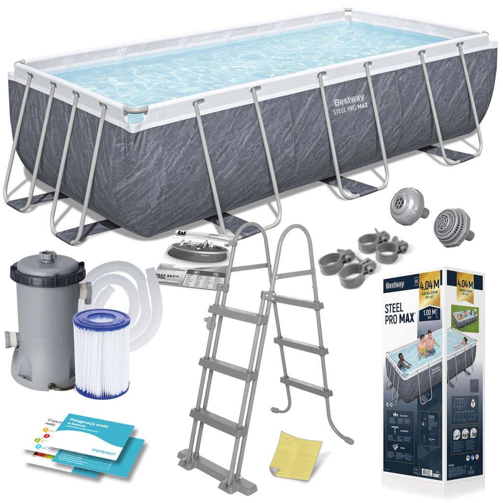 Keretes kerti medence szivattyúval 404 x 201 x 100 cm Bestway® cikkszám: 56721 HIT Ha egy nagy, megbízható medencére van szüksége, ahol szabadon úszhat - ez a tökéletes választás az Ön számára! Kész készlet komplett felszereléssel – nem kell minden elemet magának keresnie. Ha egy Bestway medencét vásárol speciális kiegészítőkkel, biztos lehet benne, hogy a legjobb minőséget kapja, és minden passzolni fog. A KÉSZLET TARTALMA Keret medence 404 x 201 x 100 cm. Szűrőszivattyú Szivattyúszűrő II Biztonságos létra Szivattyúszűrők Szivattyú bilincsek Szivattyútömlők Javítási folt Lengyel nyelvű utasítások Útmutató – letölthető az aukción Gyermekbiztonság A leszerelhető lépcsők megakadályozzák, hogy felügyelet nélkül hagyott gyerekek lépjenek be Magassága tökéletesen illeszkedik a medence méretéhez Korrózióálló, megerősített fémkeret Csúszásgátló lépcsők Kényelmes kapaszkodók A legmagasabb minőségi kidolgozás Tartós 3 rétegű PVC anyag Nylon hálós megerősítés a rétegek között Szúrásálló bevonat A medence 3 gyors lépésben készen áll: Bontsa ki a héjat, Szerelje össze a keretet - szerszámok használata nélkül Felöntjük vízzel és kész! Most egy ilyen nagy medence felállítása csak néhány pillanatot vesz igénybe MŰSZAKI ADATOK Úszómedence A medence medence méretei 404 x 201 x 100 cm A medence külső méretei: 441 x 241 x 100 cm Javasolt vízfeltöltés 90% Űrtartalma 6478 liter Szivattyú A szivattyú teljesítménye 2006 liter/óra Szivattyú tápellátása 220 - 240 V II-es típusú szivattyúszűrő (58094) ️️️ Legyen csodálatos élményekkel ez a nyár! ️️️