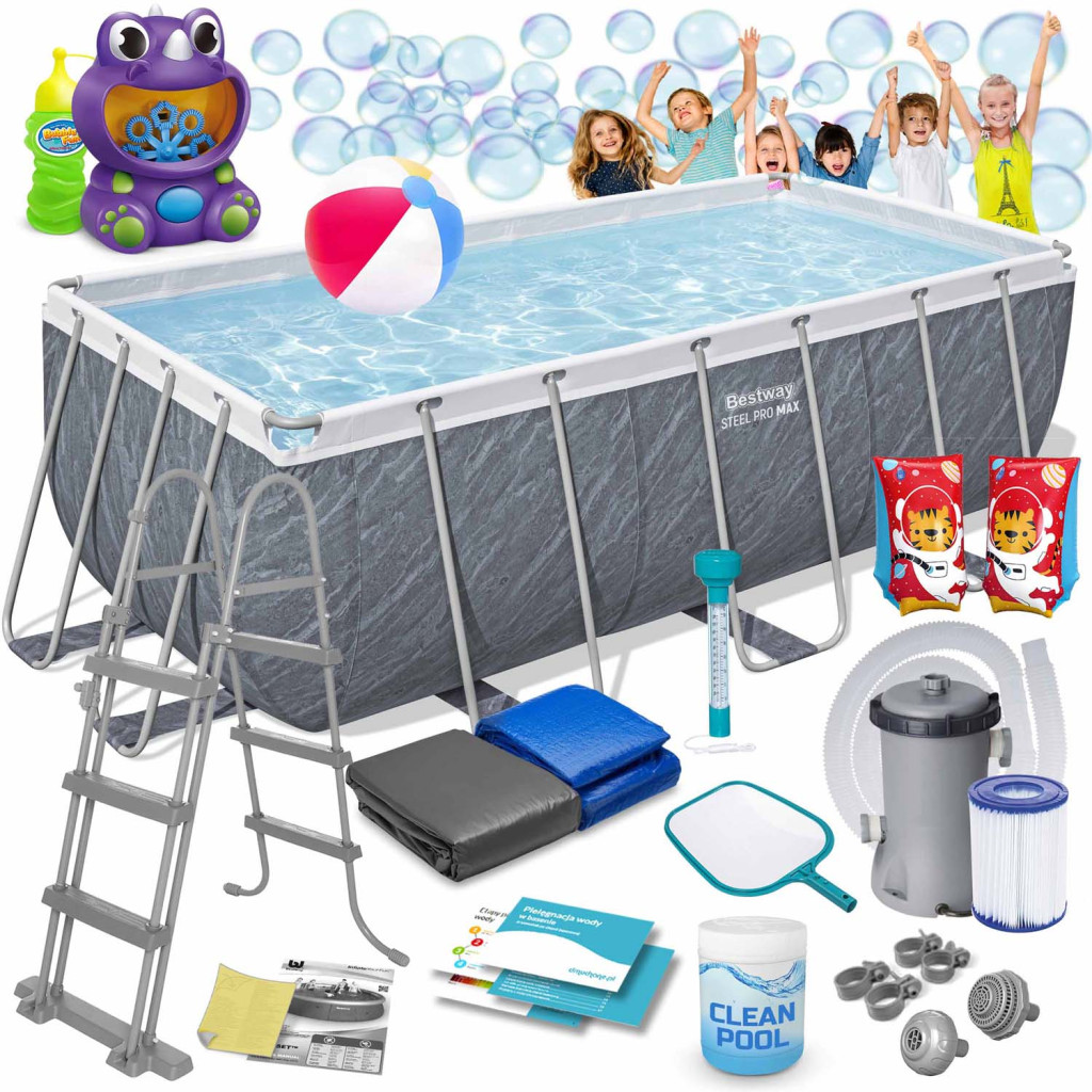 NAGY CSALÁDI MEDENCE 412x201x122 cm TELJES KÉSZLET BESTWAY® katalógusszám: 56722 A tökéletes medence az egész család számára Kész készlet komplett felszereléssel – nem kell minden elemet magadnak keresned. A medence dizájnos megjelenése minden kertben felejthetetlen hangulatot varázsol Ha a bemutatott medencét a Bestway® hivatalos képviselőjétől vásárolja meg, biztos lehet benne, hogy a termék új, eredeti és biztonságos. INGYENES buborékkészlet (játék és folyadék) A KÉSZLET TARTALMA Keretes medence 412x 201 x 122 cm. Szűrőszivattyú II típusú szivattyúszűrő Kémia - Multitabletta 25x20g Medence vegyszer adagoló Biztonságos létra Medence burkolat Medence szőnyeg Strandlabda Úszásoktató karszalagok Háló a szennyeződések felfogására Medence hőmérő Szivattyúszűrők Szivattyú bilincsek Szivattyútömlők Javítási folt Lengyel nyelvű utasítások Útmutató – letölthető az aukción Először is: gyermekbiztonság A leszerelhető lépcsők megakadályozzák, hogy felügyelet nélkül hagyott gyerekek lépjenek be Magassága tökéletesen illeszkedik a medence méretéhez Korrózióálló, megerősített fémkeret Csúszásgátló lépcsők Kényelmes kapaszkodók Másodszor: a legmagasabb minőségi kidolgozás Tartós 3 rétegű PVC anyag Nylon hálós megerősítés a rétegek között Szúrásálló bevonat Harmadszor: Tiszta víz erőfeszítés nélkül A készlet mindent tartalmaz, ami a kristálytiszta vízhez kell: Szűrőszivattyú Továbbfejlesztett szivattyúszűrő 25 több tabletta – átfogó fertőtlenítő Medence vegyszer adagoló Háló a szennyeződések felfogására Medence hőmérő Borító Megvédi a medence vizét a szennyeződésektől Megakadályozza, hogy gyermekek az Ön engedélye nélkül belépjenek a medencébe Lassítja a víz hőveszteségét Mat Megvédi az alját a sérülésektől Védelmet nyújt az ellen, hogy homok és egyéb szennyeződés kerüljön a medencébe Elszigeteli a medencét a talajtól A medence az egész család számára szórakoztató Gyermekeire gondolva hozzáadjuk kedvenc kiegészítőiket: Úszó karszalagok Színes labda MŰSZAKI ADATOK Úszómedence A medence medence méretei 412 x 201 x 122 cm A medence külső méretei: 462 x 254 x 122 cm Medence súlya 75,9 kg Javasolt vízfeltöltés 90% Űrtartalom 8124 liter Szivattyú Kapacitása 2006 liter/óra Tápellátás 220 - 240 V Szivattyúszűrő Type II (58094) A szivattyú súlya 2 kg ️️️ Legyen csodálatos élményekkel ez a nyár! ️️️ Figyelmeztetés: Az úszókarszalag nem játék, nem életmentő felszerelés, és nem véd a fulladás ellen. Felnőtt felügyelete mellett olyan mélységű vízben használható, ahol a gyermek a lába alatt érzi a fenekét. A megfelelő felfújás és a felszerelés használata elengedhetetlen a biztonság érdekében, ne fújja túl. Győződjön meg arról, hogy a biztonsági szelep szorosan zárva van, és a varratok nincsenek repedve. Súlytartomány 18-30 kg, életkor 3-6 év.