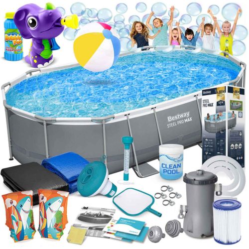 Power Steel vázas kerti medence 488 x 305 x 107 cm MEGA készlet 18 az 1-ben BESTWAY® katalógusszám: 56448 HIT Ha egy nagy, megbízható medencére van szüksége, amelyben szabadon úszhat - ez a tökéletes választás az Ön számára! Kész készlet teljes felszereléssel – nem kell minden elemet magának keresnie. Ha egy Bestway medencét vásárol speciális kiegészítőkkel, biztos lehet benne, hogy a legjobb minőséget kapja, és minden passzolni fog. INGYENES köpölyözés készlet (játék és folyadék). TARTALOM BEÁLLÍTÁSA Keret medence 488 x 305 x 107 cm Szűrőszivattyú Szivattyúszűrő Többfunkciós tabletták Vegyszer adagoló Biztonságos létra Medence burkolat Medence szőnyeg Felfújható labda Úszóujj Háló a szennyeződések felfogására Lebegő hőmérő Szivattyúszűrők Szivattyú bilincsek Szivattyútömlők Javítsa ki a javítást Lengyel nyelvű utasítások Útmutató – letölthető az aukción Gyermekbiztonság A leszerelhető lépcsők megakadályozzák, hogy felügyelet nélkül hagyott gyerekek lépjenek be A magassága tökéletesen illeszkedik a medence méretéhez Korrózióálló, megerősített fémkeret Csúszásgátló lépcsők Kényelmes kapaszkodók A legmagasabb minőségi kidolgozás Tartós 3 rétegű PVC anyag Nylon hálós megerősítés a rétegek között Szúrásálló bevonat A belső tér fehér és kék mozaikot imitál Borító Megvédi a medence vizét a szennyeződésektől Megakadályozza, hogy gyermekek az Ön engedélye nélkül belépjenek a medencébe Lassítja a víz hőveszteségét Mat Védi az alját a sérülésektől Védelmet nyújt az ellen, hogy homok és egyéb szennyeződés kerüljön a medencébe Elszigeteli a medencét a talajtól Chemconnect™ flow vegyszer-adagoló A medence vegyszerek alkalmazása még soha nem volt ilyen biztonságos! Az integrált, automata, átfolyó klóradagoló a medencében nem igényel kézi működtetést. Az eszköz a szivattyúval együttműködve egyenletesen oszlatja el a klórt a medencében. MŰSZAKI ADATOK Úszómedence A medence medence méretei 488 x 305 x 107 cm A medence külső méretei 488 x 347 x 107 cm Súlya 67,2 kg Javasolt vízfeltöltés 90% Űrtartalom 10 949 liter Szivattyú A szivattyú teljesítménye 3028 liter/óra Szivattyú tápellátása 220 - 240 V II-es típusú szivattyúszűrő (58094) ️️️ Legyen csodálatos élményekkel ez a nyár! ️️️