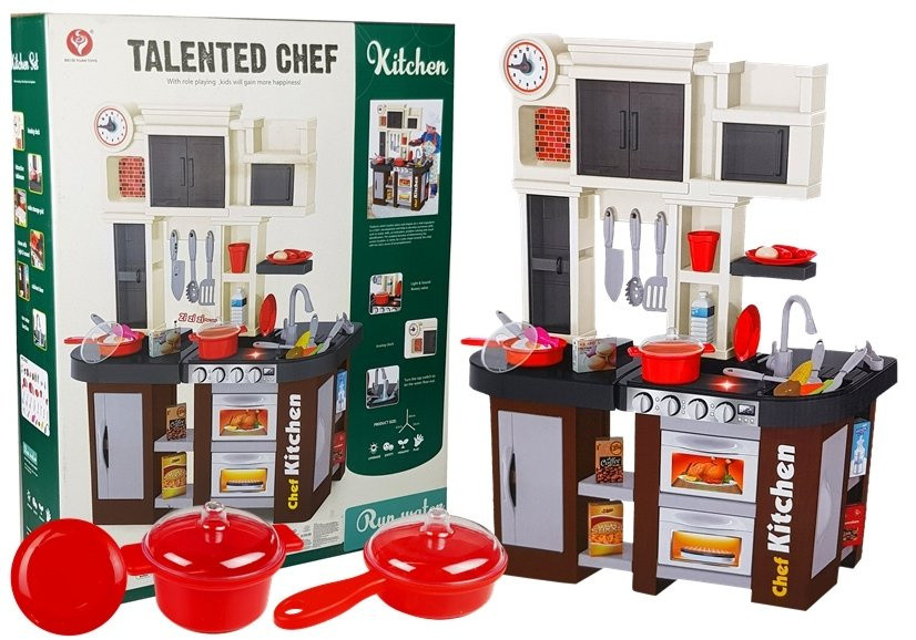 INTERAKTÍV KONYHA HŰTŐSZEKRÉNYVEL, PÁRAELSZÁMÍTÓVAL ÉS VÍZCSAPAL – 58 DARABOS Ez a nagyméretű interaktív konyha egyedülálló választás azoknak a gyerekeknek, akik imádnak főzni és arról álmodoznak, hogy igazi szakácsok legyenek. Folyóvízzel, világító égőfejekkel, valósághű főzési és sütési hangokkal, valamint számos kiegészítővel felszerelve, végtelen lehetőséget kínál a kreatív játékra. A konyhában nyitható szekrények, sütő és hűtőszekrény található, így a játék még realisztikusabb. A mozgatható óramutatók megtanítják a kisgyermekeket az időmérés alapjaira, a kiegészítők széles választéka pedig lehetővé teszi a különféle szerepjátékokat. Kiváló minőségű, biztonságos anyagokból készült, ez a játék 3 éves kortól alkalmas. A készlet 58 darabot tartalmaz – edényeket, serpenyőket, evőeszközöket, tányérokat, zöldségeket, élelmiszereket és matricákat, amelyekkel a gyerekek maguk díszíthetik a konyhát. Ezáltal a játék nemcsak lebilincselő, hanem stimuláló is. MŰSZAKI ADATOK: Játéktípus: interaktív konyha gyerekeknek Funkciók: fény- és hangjelző égőfejek, vízcsap, nyitható szekrények, hűtőszekrény, sütő, mozgó óra Elemek száma: 58 darab Konyha magassága: kb. 84 cm Szélesség: kb. 63 cm Mélység: kb. 35 cm Csomag méretei: kb. 69 cm x 55 cm x 14 cm Tápellátás: 3 x AA 1,5 V (nem tartozék) Anyag: kiváló minőségű műanyag KÉSZLET TARTALMA: Interaktív konyha hűtőszekrénnyel, páraelszívóval, vízcsappal és sütővel Matricák a konyha díszítéséhez Serpenyők, edények fedővel Evőeszközök és konyhai kiegészítők (spatulák, merőkanalak, kések, fogó) Tányérok, poharak, üvegek Zöldségek és élelmiszerek (káposzta, sárgarépa, burgonya, kukorica, tojás, kolbász, hal) Nyomtatott kartondobozok (kávé, tej, édességek, kekszek, fagylalt)