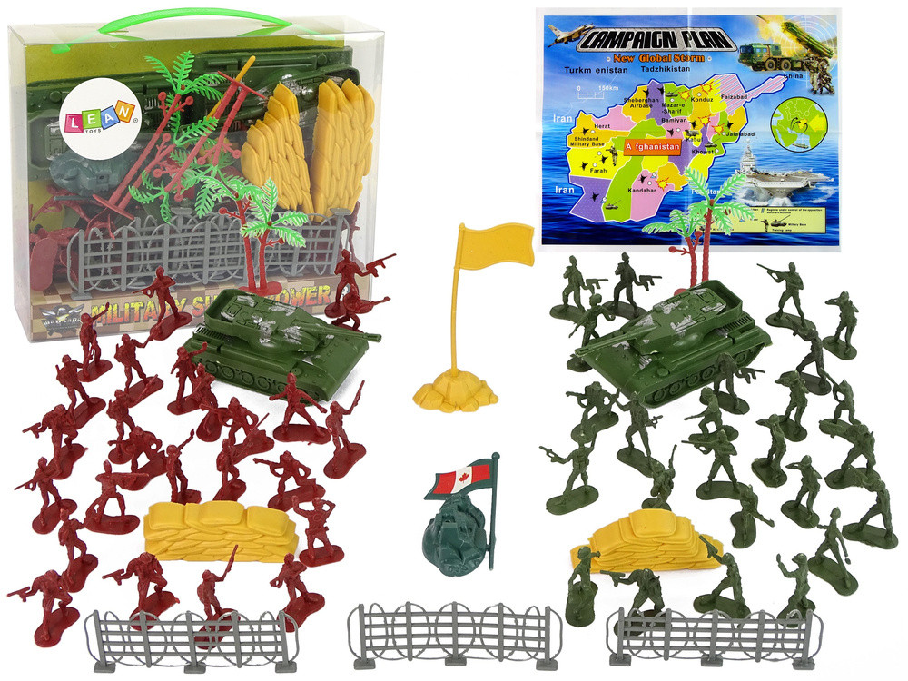 Nagy katonai készlet Katonák Tankok A bemutatott készlet szokatlan meglepetés lesz a hadsereg és a katonai témák minden rajongója számára. A számos kiegészítő elrepít a háborús csaták világába, és gondolkodásra késztet, miközben háborús stratégiákat alkotsz. A több darabos készletet kifejezetten a kis katonák számára készítették, akik szenvedélyesen rajonganak ezért a hősies, mégis veszélyes hivatásért. A katonai készlet különféle elemekből áll, amelyek lehetővé teszik, hogy fontos csatákat vívj, és mindenekelőtt hatékonyan védd meg a területed. A készlet elemei a fiúk meglévő gyűjteményének bővítésére is használhatók, változatosabbá téve a játékot. A figurák harcias, tompa színekben készültek és készültek, ami sokkal könnyebbé teszi az álcázást, és lehetővé teszi számukra, hogy elrejtőzzenek az ellenség elől. A katonai tank lehetővé teszi az ellenséggel szembeni kiegyenlített küzdelmet. A zsákok és fák lehetővé teszik a biztonságos elrejtőzést, valamint az ellenség meglepetésszerű támadásait. Az összes figura súlya nagyon könnyű, míg a játékok méretei a néhány éves gyermekek kezéhez igazodnak, így a játék nagyon kényelmes és egyszerű. A készlet tartalma: - katonák - két tank - egy vizesárok, - 2 akadály, - 2 pálma,   A kiválasztott darabok méretei: - katona: 4 cm magas - vizesárok: 7 cm x 3 cm x 1,5 cm - tank: 9 cm x 4 cm x 4 cm Csomag méretei: 19 cm x 16 cm x 6 cm A készlet minden darabja átlátszó műanyag dobozban található. Méreteinek köszönhetően a játék 3 éves kortól alkalmas gyermekek számára. A termék minden eleme megfelel az EN 71 szabványnak.