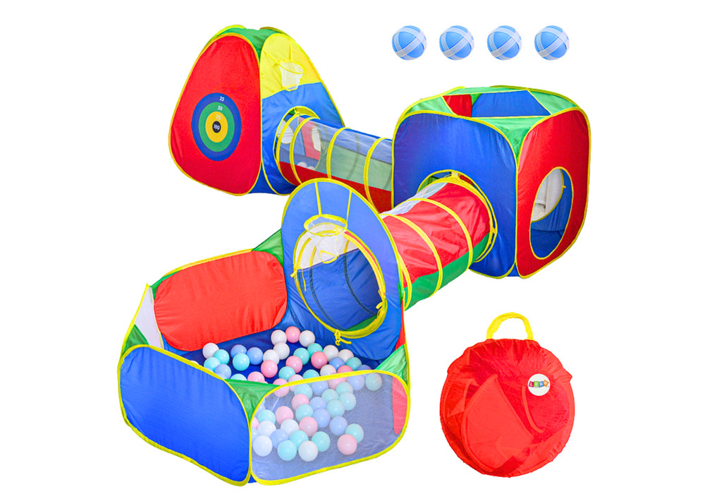 Nagy játszótéri sátor gyerekeknek, alagutak, labdamedence, színes. A gyerek sátor szett teljesen mobil, könnyen összecsukható és kinyitható korlátozás nélkül. Az elemek szinte maguktól kibontakoznak, miután kivették őket a táskából. Szabadon kombinálhatók, és a fixáláshoz csak át kell kötni őket a rögzített szalagokkal. Ez a szett sokkal több, mint egyszerű sátrak. Ez egy interaktív tér, amely kreatív játékra ösztönzi a gyerekeket. A kicsik menedéket hozhatnak létre, alagutakban mászhatnak, céllövészetben versenyezhetnek, vagy labdákat dobálhatnak a kosárba. Az alagút sátrak további funkciókkal vannak felszerelve, amelyek még több szórakozást nyújtanak. A háromszög alakú sátorban egy tépőzáras labdákkal ellátott lőcél található, amelyek a szett részét képezik. A négyzet alakú sátornak két bejárata van, és a sátrakat alagutakkal köti össze, lehetővé téve a gyerekek számára, hogy szabadon mozogjanak egyik sátorból a másikba. A labdamedence dobókosárral rendelkezik. A szett tartós anyagból készült, amely tartósságot és ellenállást biztosít az intenzív játékkal szemben. A sátorfalak egy része hálóból készült, ami lehetővé teszi a szülők számára, hogy szemmel tartsák gyermekeiket, miközben bent játszanak. A szett összecsukva kompakt, így könnyen hordozható és bárhová magával viheti, például a strandra vagy a kertbe. Egy gyereksátor szett tökéletes választás beltéren és kültéren egyaránt. A különféle funkcióknak és konfigurációs lehetőségeknek köszönhetően a gyerekek kreatív és aktív játékkal tölthetik az időt, fejlesztve kézügyességüket és koordinációs készségeiket. A szett nem tartalmaz műanyag labdákat. A háromszög alakú sátor méretei: 90cm x 75cm Alagút méretei: 102cm x 45cm Száraz medence méretei: 120cm x 71cm x 57cm Négyzet alakú sátor méretei: 77cm x 73cm Táska méretei: 50cm x 50cm x 7cm CE tanúsítvánnyal rendelkezik és megfelel az EN71 szabványnak. 3 év feletti gyermekek számára készült.