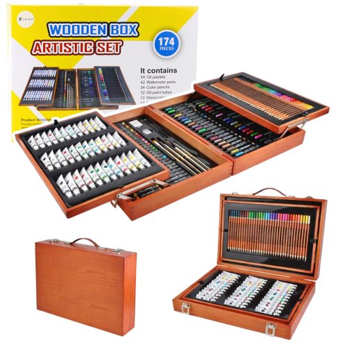 Nagy professzionális festőkészlet fa hordtáskában, 174 darabos