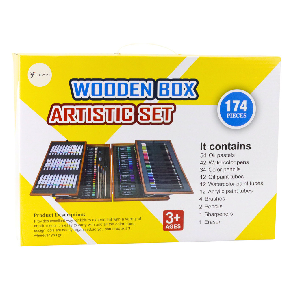 Nagyméretű professzionális festőkészlet, fa hordtáskában, 174 darabos! Gyermekeknek és felnőtteknek. Művészeti készlet gyermekeknek és felnőtteknek, amely tökéletes ajándék bármilyen alkalomra. A rajzolás és a festés befolyásolja a gyermek kismotoros készségeinek megfelelő fejlődését. Serkenti a kreativitást, de edzi a gyermek agyát is, és felkészíti az írás tanulására. A zsírkréták, festékek és filctollak többszínű készlete hosszú játékidőt tesz lehetővé, és lehetővé teszi a tartalom megosztását más gyerekekkel. Mindez elegáns, fémkapcsos fadobozban csomagolva. A készlet tartalma: - 34 db intenzív színű zsírkréta - 42 db filctoll - 54 db olajpasztell - 2 db ceruza - 4 db különböző méretű ecset - 12 db olajfesték - 12 db akvarellfesték - 12 db akrilfesték - Radír - Radír 174 elem - a hatalmas választékkal könnyedén elkészítheted a legötletesebb, legkreatívabb és legeredetibb alkotásokat. A teljes készlet egy fadobozban található, így a teljes tartalom szállítása egyszerű és kényelmes; ráadásul fogantyúval is rendelkezik a kényelmes hordozáshoz. Miután az eredeti evőeszközöket felhasználtad, sikeresen megtöltheted a tokot saját új kiegészítőiddel. A különálló rekeszek gyors és egyszerű hozzáférést biztosítanak a szükséges tárgyakhoz, valamint gondoskodnak arról, hogy azok védve és rendezetten legyenek a tokban, így bárhová magaddal viheted. A teljes készlet rendkívül impozánsnak tűnik, és ajándéknak is tökéletes!