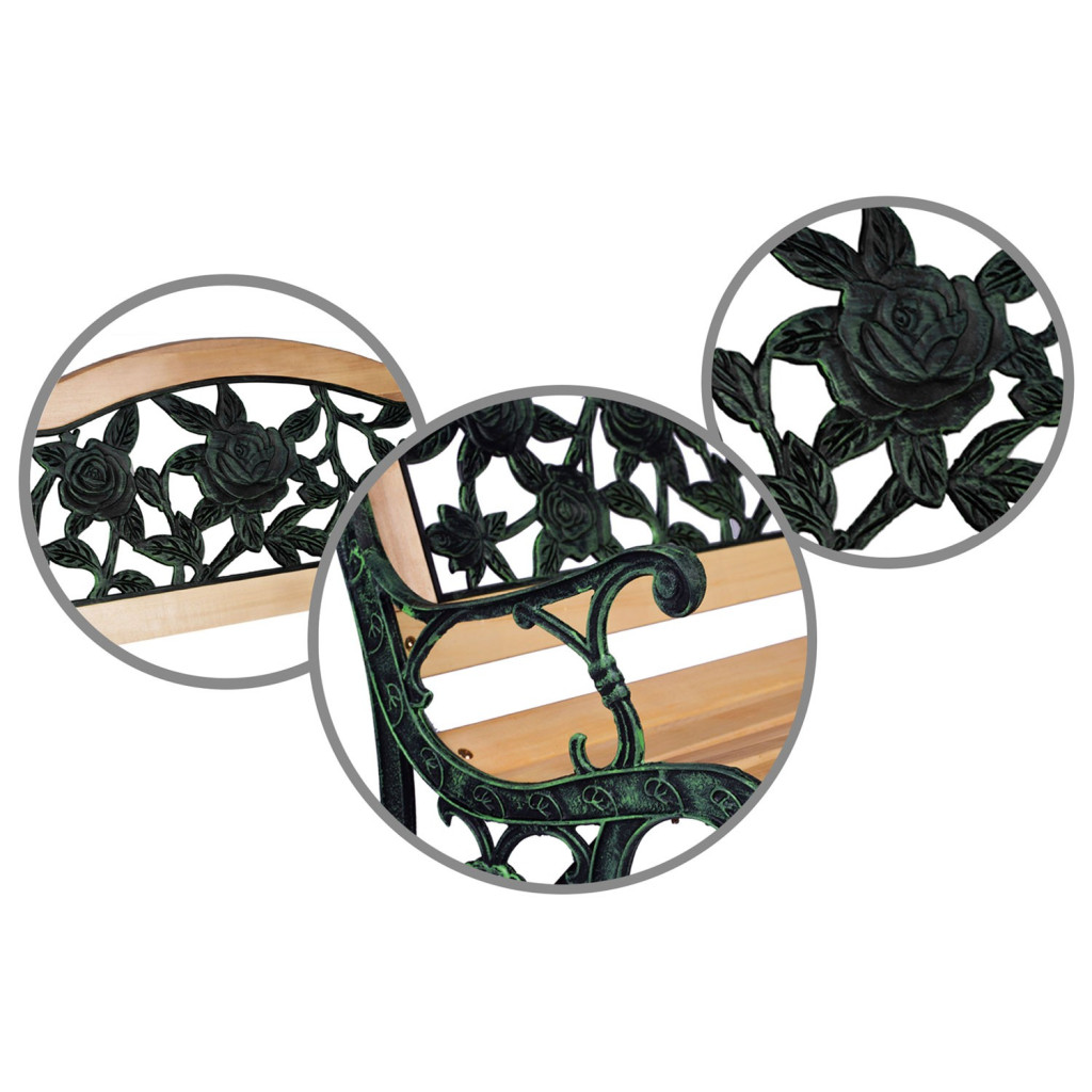 időjárás ellen védett lakkozott fa - egész éves használatragyönyörű nyárfaklasszikus és elegáns stílusromantikus virágdíszek a háttámlánerős vaskeret, oldalain precíz díszítésselkényelmes ülés biztosítja a kényelmes használatot