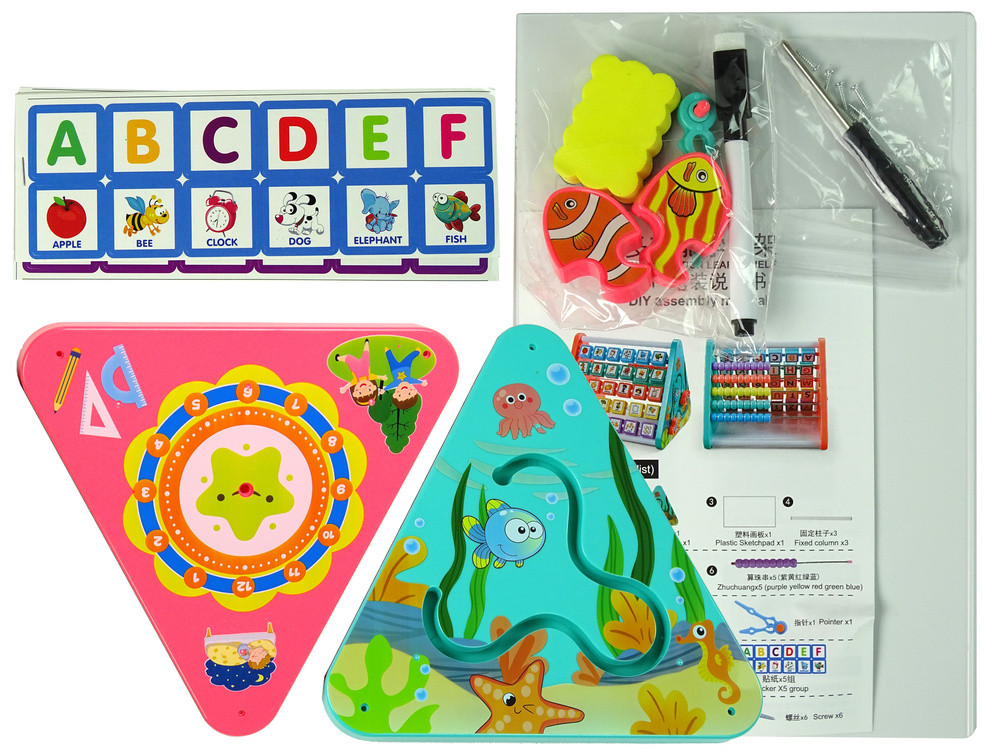 Tanulópolc Háromszög Számlálók Betűk Tárgyak Állatok Ez az oktatópolc segít gyermekének megismerni a világot különféle játékokon keresztül. Sokféleképpen fejleszti a kisgyermek kézügyességét és képzelőerejét. Támogatja a számolás vagy a betűk megjelenésének tanulását. Nagyon hasznos játék az iskolai élet első lépéseinek megtételekor. A gyerekek tanulási élményének megszerzése az egyik legnehezebb feladat, amivel a legtöbb szülő és gondozó szembesül. Tudjuk a titkot, hogy a gyerekek ne is érezzék, hogy tanulnak - a szórakozás a legjobb módja. Játékunk 5 módon használható. Funkciók: - óra ​​- Rajztábla - Gyöngyök / abakusz - labirintus halakkal - négyzetek betűkkel, tárgyakkal és állatokkal A masszív kidolgozás és az élénk színek ezenkívül felkeltik a gyermek figyelmét, ösztönözve az eredeti játékot. A készlet elemei: - matricák - tábla - 2 hal - radírozható szivacs - filctoll - 5 sor kockák - 5 sor gyöngyök - összeszerelendő elemek   A játék méretei: 25 cm x 25 cm x 25 cm Csomag méretei: 29 cm x 29 cm x 8 cm A játék 3 év feletti gyermekek számára készült. Megfelel az EN71 szabványnak és CE tanúsítvánnyal rendelkezik.