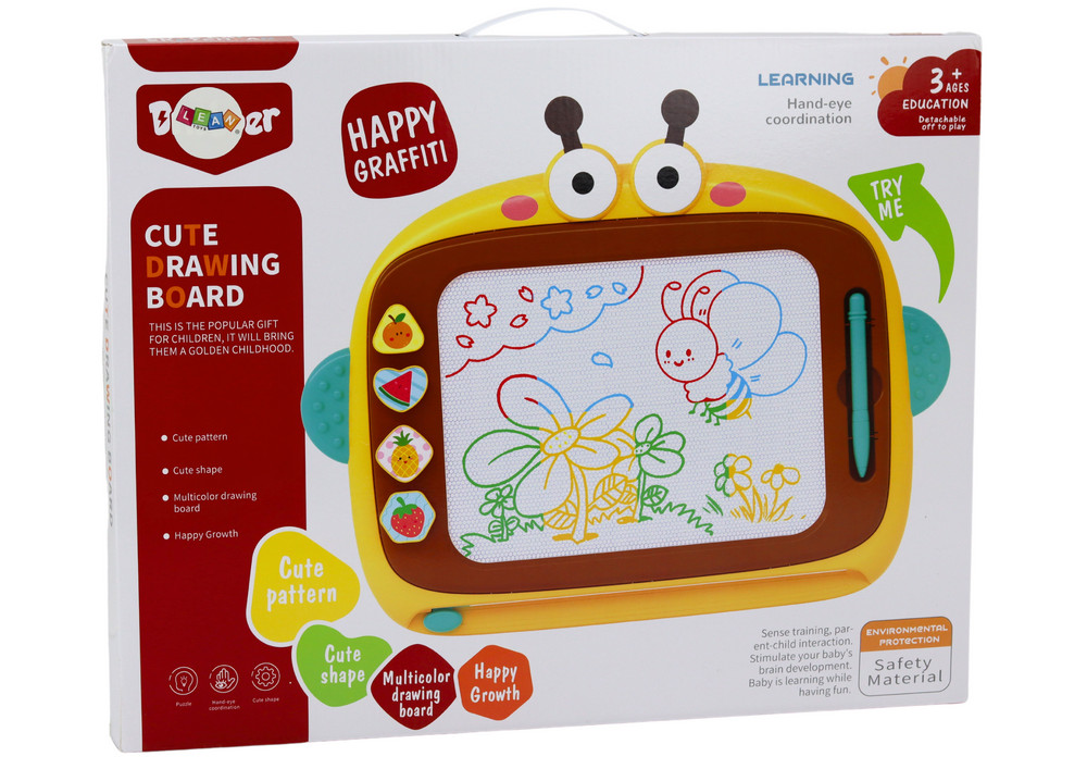 Mágneses festőtábla 4 színben, leírással, 4 bélyegző, rózsaszín A krétatábla egy időtlen játék, tökéletes rajzoláshoz és tanulási segédeszközként. Számtalanszor használható eltűnő képek írására és rajzolására! A scrapbooking is nagyszerű szórakozási forma, és segít fejleszteni a gyermek kézügyességét és művészi készségeit. Hogyan működik a varázslatos mágneses tábla? Ez egy nagyon egyszerű oktatójáték. A képernyő felülete alatt vasforgácsok vannak elhelyezve, amelyeket egy speciális tollal rajzolva a gyermek által 4 színben (kék, sárga, zöld és piros) létrehozott mintázatba rendeznek. A rajzok tetszőleges alkalommal elkészíthetők - a kép törléséhez csak finoman mozgasd a csúszkát az elem alján. Ahhoz, hogy a mágneses jegyzetfüzet sokáig szolgálja a gyermeket, csak a készletben található mágneses tollal és bélyegzőkkel szabad használni. Semmilyen körülmények között ne használj klasszikus tollakat, filctollakat vagy tintatollakat a képernyőn. A táblán olyan kiegészítők is találhatók, mint négy bélyegző háromszög, szív, négyzet és hatszög formájában, amelyek például a matematika tanulásánál lesznek hasznosak. A készlet rózsaszín színben készült, és további előnyei közé tartozik: fogantyúk a tábla tartásához és összecsukható tartók, amelyek megkönnyítik a tábla kényelmes elhelyezését az asztalon. A teljes kézirat méretei: 50cm x 40cm x 4cm A képernyő méretei: 30cm x 22cm A csomag mérete: 51cm x 41cm x 4cm CE tanúsítvánnyal rendelkezik és megfelel az EN71 szabványnak. 3 év feletti gyermekek számára készült.