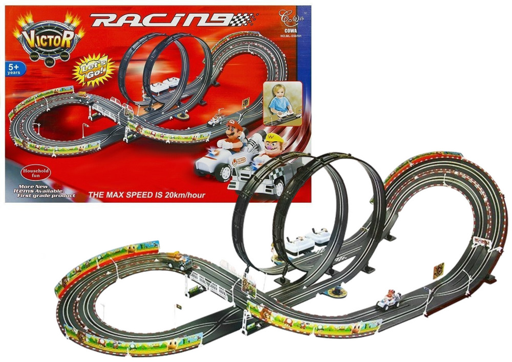 ELEKTROMOS VERSENYPÁLYA 452 cm! A két autóval ellátott elektromos pálya serkenti gyermeked fantáziáját, és igazi versenypálya-érzetet ad. A több mint 452 cm-es versenypálya és 2 hurok minden gyermek számára örömet okoz. 2 nagy hurok biztosítja a lenyűgöző versenyt! A csodálatos versenypálya vezérlői potenciométerrel szabályozhatják a vezetési sebességet, turbó gombbal és irányváltóval vannak felszerelve. A versenyautók LED diódákkal vannak felszerelve, amelyeken a játékfigurák monogramja látható. A pályával való játék serkenti a gyermek kreativitását, és tökéletesen fejleszti a kézügyességet és a képzeletet. A pálya megépítése sok örömet okoz minden fiúnak gyermekkorban! A készlet tartalma: - 2 db kisautó - 2 db elemes vezérlő - 452 cm teljes hosszúságú járművekhez való sínek, - 2 db számláló - tápegység - tartozékok A csomag méretei: - hosszúság: 72 cm - szélesség: 47 cm - vastagság: 7 cm Elemes vonat: AA (4 x 1,5 V - nem tartozék) A játék esztétikus csomagolásban található, és 5 év feletti gyermekek számára készült!