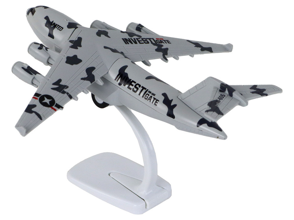 Katonai szürke terepszínű UNITED HW-605 repülőgép figura   Ez a katonai repülőgép modell lenyűgöző megjelenésű. Jellegzetes terepszínű mintázattal van festve, ami katonai jelleget kölcsönöz neki, és nagyon hitelesnek tűnik. A színek és a minta a katonai stílusra utal, ami valódi karaktert kölcsönöz a játéknak. A repülőgép akár négy motorral is fel van szerelve, ami egy erőteljes, bevetésre kész gép benyomását kelti. Ezek a részletek még lenyűgözőbbé és realisztikusabbá teszik a játékot. Ez a játék interaktív hang- és fényhatásokat kínál, amelyek jelentősen gazdagítják a szórakozást. A repülőgép első kerekeinek megnyomása után a kabinban lévő lámpák felvillannak, és a repülőgépből kiszűrődő hangok egy hatalmas repülőgép felszállására emlékeztetnek. Ez valóságérzetet ad, és lehetővé teszi a gyerekek számára, hogy pilóták szerepét öltsék magukra. A készlet tartalmaz egy állványt, amelyre a repülőgép elhelyezhető. Ez egy tökéletes módja annak, hogy ezt a lenyűgöző modellt polcon vagy asztalon mutassuk be. A repülőgép dekorációként vagy egy gyűjtemény részeként is kezelhető, ami tovább hangsúlyozza az értékét. Ez a játék egy további jellemzője. A repülőgép súrlódós meghajtással rendelkezik, ami azt jelenti, hogy a gyerekek különböző felületeken tolhatják, ami interaktivitást és mozgást biztosít játék közben. Ez a valósághű United katonai repülőgép modell nemcsak játék, hanem lenyűgöző dekoratív és gyűjtői darab is. Segít fejleszteni a gyermekek képzeletét, és arra ösztönzi őket, hogy történeteket meséljenek és felfedezzék a katonaság világát. Ez egy nagyszerű ajándék a kis repülés és katonai rajongók számára, akik értékelni fogják a játék hitelességét és minőségét.   A készlet tartalma: - Repülőgép - Állvány - Eredeti csomagolás   A repülőgép méretei: 22 cm x 22 cm x 5 cm   A csomag mérete: 25 cm x 18 cm x 7 cm   A repülőgépet három 1,5 V-os AG13 elem táplálja, amelyek a játékba vannak helyezve.   CE tanúsítvánnyal rendelkezik és megfelel az EN71 szabványnak. A játék 3 év feletti gyermekek számára készült.