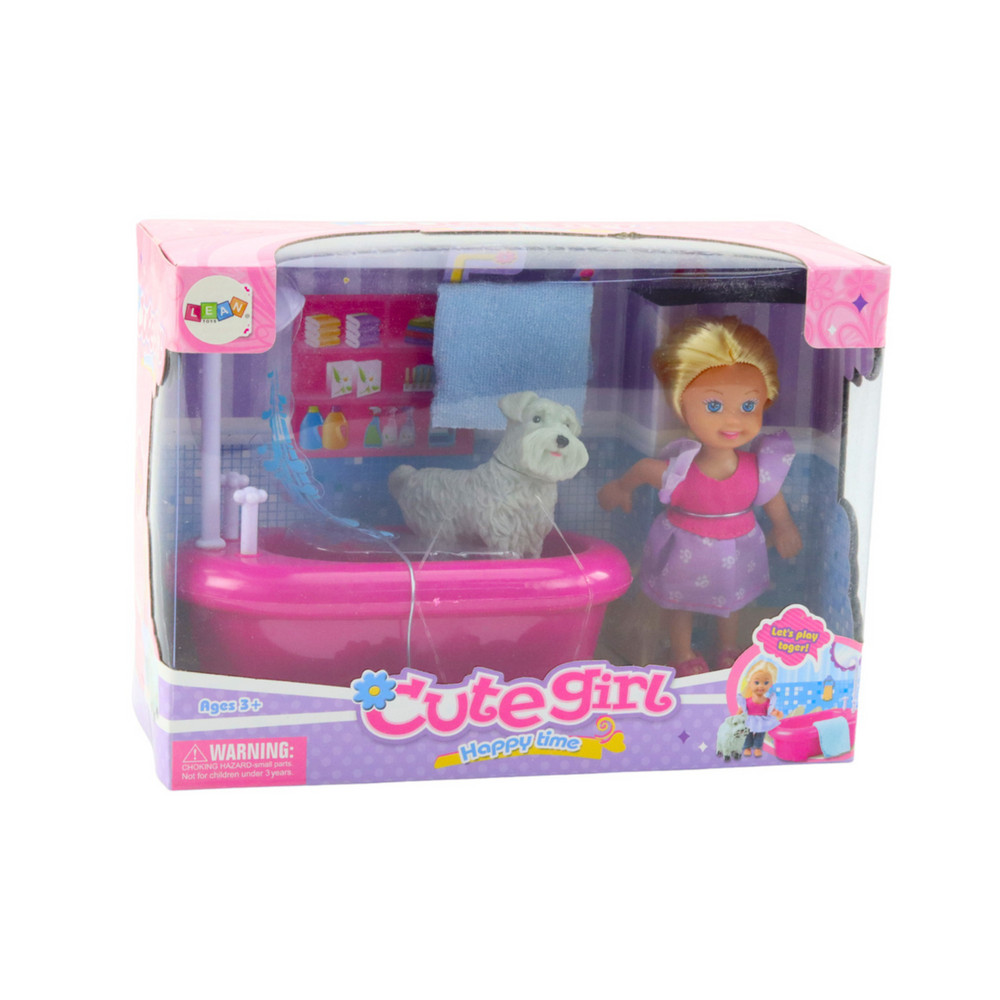 Mini baba szett fürdőkáddal és fehér kutya rózsaszínnel