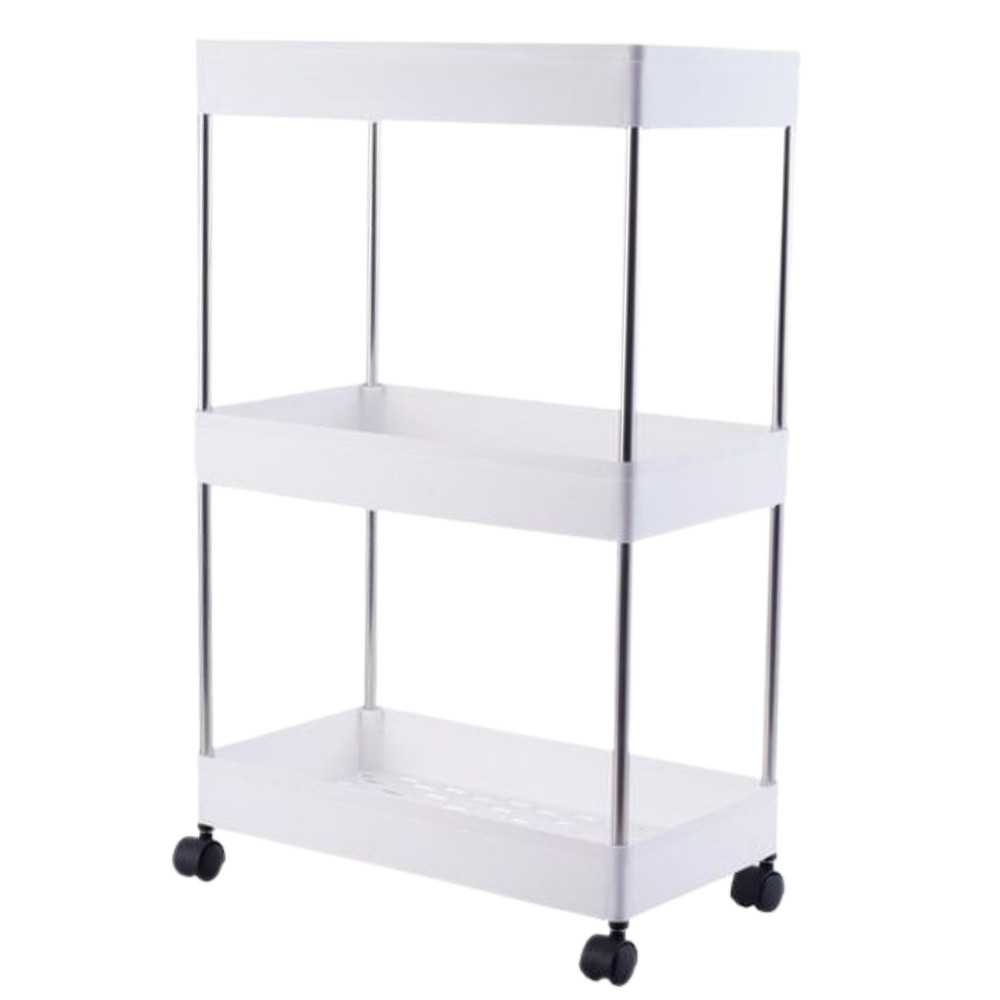 Mobil polc 3 polccal, fehér, kerekeken Praktikus megoldást keres otthonába? Mobil polcunk kerekeken kiváló választás! Modern kialakításának és funkcionalitásának köszönhetően tökéletes lesz a konyhába, nappaliba, hálószobába vagy fürdőszobába. Termék előnyei: Masszív konstrukció: Kiváló minőségű anyagokból készült, biztonságot nyújt a tárolt tárgyak számára. Funkcionalitás: 3 tágas polc segít a fűszerek, kozmetikumok, könyvek és egyéb szükséges dolgok rendszerezésében. Esztétikus megjelenés: Az elegáns fehér szín illeszkedik a modern enteriőrökbe. Könnyű összeszerelés: A polc gyorsan összeszerelhető a mellékelt utasítások segítségével. Mobilitás: A 3 kerék lehetővé teszi a polc könnyű mozgatását, a kettőn található zár pedig stabilitást biztosít. További tartozékok: A készlet fehér kampókat tartalmaz, amelyek növelik a funkcionalitását. Specifikáció: Méretek: 34,5 x 12 x 86 cm Szín: Fehér Anyag: Műanyag és fém