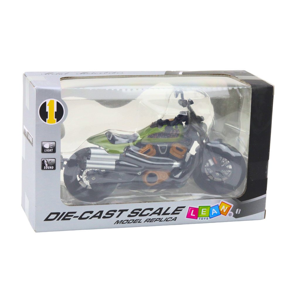Motorkerékpár Chopper Fém Fények Hangok Fekete Zöld Elemek 1:12