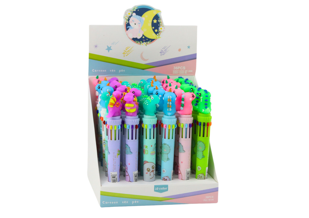 Többszínű dinoszauruszos automata toll 10 színkeverékEz a funkcionális toll ötvözi a szórakozást és a praktikumot, akár 10 színt kínálva egyetlen íróeszközben. A toll egy aranyos dinoszaurusz motívummal díszített, amely biztosan felkelti a gyerekek figyelmét, és izgalmasabbá teszi a mindennapi írást. Több tintával van felszerelve, így könnyen válthat színeket anélkül, hogy tollat ​​kellene cserélnie. Minden szín tökéletes a különféle alkalmazásokhoz, a rajzolástól az írásig.A szín váltásához egyszerűen nyomja meg a dinoszaurusz figurát, így a színváltás gyors és szórakoztató. Ez az intuitív megoldás megkönnyíti a gyerekek számára a megfelelő szín kiválasztását minden egyes munkához. Ez a toll nagyszerű módja annak, hogy felkeltse az érdeklődést az írás és a rajzolás iránt. A színes tinta és az interaktív dinoszaurusz motívum kombinációjának köszönhetően a toll vonzó és praktikus eszközzé válik a tanuláshoz és a játékhoz.  Az ár egy tollra vonatkozik, a gyűjtőcsomag 36 darabot tartalmaz. A szín véletlenszerűen kerül kiválasztásra.  CE tanúsítvánnyal rendelkezik. 3 év feletti gyermekek számára készült.