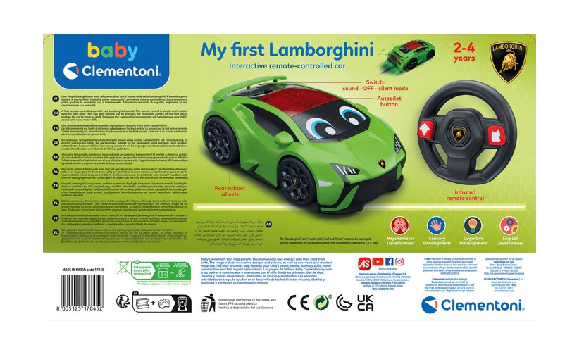 Az első távirányítós Lamborghini Huracan Clementoni 17845 Soha nem túl korán álmaid autójához… Bemutatkozik a Baby Clementoni „Első Lamborghini” távirányítója! Az infravörös távirányítóval a gyerekek könnyedén vezethetik az autót. Az autó valósághű hangokat ad ki, órákig tartó szórakozást nyújtva, miközben támogatja a kéz-szem koordinációt. Az autó üldözése és irányítása természetes módon segíti a motoros készségek fejlesztését. Az egyedi Huracan dizájn ötvözi a stílust a Clementoni játékok élményével és biztonságával. Olaszországban tervezték, fejlesztették és fejlesztették. Fejlődést segítő kéz-szem koordináció Finommotoros készségek Kognitív és megfigyelőképesség Termékleírás 2–4 éves korig Doboz méretei 36 × 21 × 15 cm Tömeg 761 g Elem szükséges: igen Elemek mellékelve: 4 × AA LR06 Nem tartalmaz 2 × AAA LR03Copyright „Az Automobili Lamborghini, a bika és pajzs szimbólummal ellátott Automobili Lamborghini védjegyeit, szerzői jogait és formatervezési mintáit az Automobili Lamborghini S.p.A., Olaszország licencével használjuk.” A tökéletes első RC Lamborghini a nagyot álmodó és biztonságosan játszó kis autórajongók számára