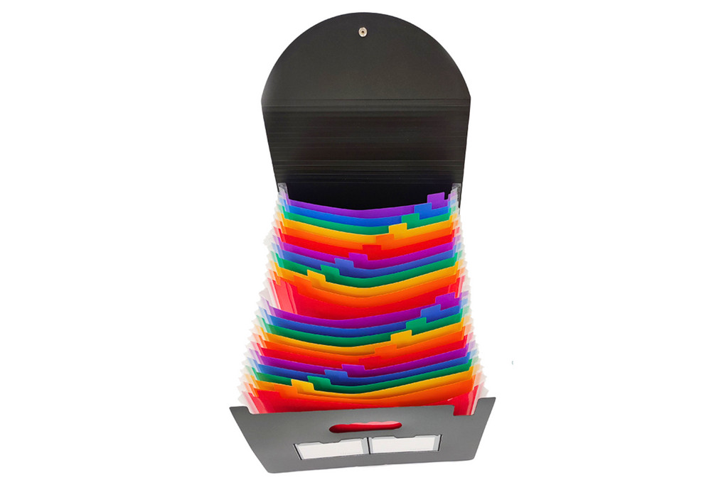 Szervező mappa rekeszekkel, színes fülekkel, A4-es dokumentumokhoz. Rendszerezze dokumentumait stílusosan és funkcionálisan A4-es dokumentumokhoz, a tartósságot és a kényelmet szem előtt tartva. Tartós, nem deformálódó anyagból készült, a mappa hosszú távú használatot és dokumentumok hatékony védelmét biztosítja. Masszív, nem deformálódó anyag, amely garantálja a hosszú távú használatot és ellenáll a mindennapi kopásnak és kopásnak. A mappa akár 24 zsebet is tartalmaz A4-es dokumentumok számára, mindegyik zseb más színű, ami lehetővé teszi a dokumentumok egyszerű és gyors rendezést és hozzáférést. Minden zseb elég tágas ahhoz, hogy akár több száz papírlapot is befogadjon, így a mappa ideális nagyszámú dokumentum tárolására. A zsebek jelölővel megjelölhetők, így könnyebb a rendszerezés és a szükséges dokumentumok megtalálása. Ennek köszönhetően gyorsan azonosíthatja az egyes zsebek tartalmát. A rugalmas szalag lehetővé teszi a mappa biztonságos bezárását, biztosítva, hogy a dokumentumok ne essenek ki és ne gyűrődjenek. A mappában van egy kijelölt hely, ahová elhelyezheti nevét, vezetéknevét vagy más fontos azonosító adatait. Ez a mappa ötvözi a funkcionalitást az esztétikával, hatékony megoldást kínálva a dokumentumok rendszerezésére az irodában, az iskolában vagy otthon. Színes zsebei és rugalmas szalagja kényelmet és könnyű használatot biztosítanak a mindennapi használat során. A mappa méretei: 34 cm x 25 cm x 4 cm. CE minősítéssel rendelkezik. 3 év feletti gyermekek számára készült.