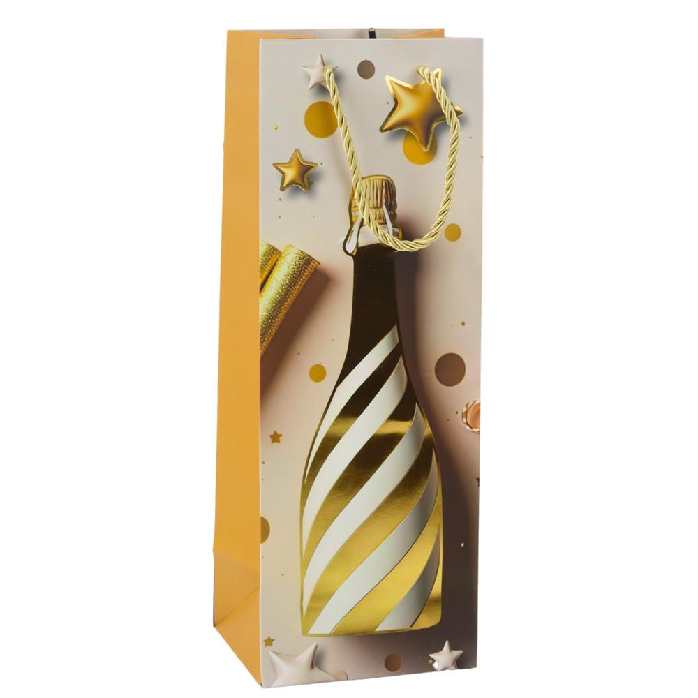 PEZSGŐS MOTÍVUMÚ AJÁNDÉKTASAK ÜVEGEKHEZ Egy elegáns és hatékony ajándéktasak palackokhoz nagyszerű módja annak, hogy egyedien csomagoljunk alkoholt vagy más alkoholos italokat bármilyen alkalomra. A táska modern és partiszerű dizájnjával tűnik ki, pezsgősüvegeket mutatva be színes konfetti, csillagok és fényes dekorációk között. Ideális választás születésnapokra, szilveszterre, esküvőkre, évfordulókra vagy egyéb ünnepségekre, ahol az ünneplés és az ünneplés áll a középpontban! A táska tartós díszkartonból készült, amely garantálja a szilárdságot és a tartósságot, még nehezebb palackok hordozása esetén is. Az arany színű fonott fogantyú eleganciát kölcsönöz és kényelmes hordozást biztosít. A pezsgőmotívum és a fényes díszítések nagyon hatásossá teszik a táskát és vonzzák a figyelmet. 35 x 12 x 9 cm-es méreteivel a táska tökéletes egy szabványos borosüveg, pezsgő vagy más alkoholos ital számára. Nagyszerű módja annak, hogy hangsúlyozzuk a pillanat egyediségét és ragyogást adjunk bármilyen ünnepségnek. SPECIFIKÁCIÓ: Típus: Üveges ajándéktasak Téma: Pezsgős üvegek, konfetti, csillagok Színek: Rózsaszín, bézs, arany, kék Táska méretei: 35 x 12 x 9 cm Anyag: Tartós díszkarton Fogantyúk: Arany fonással Célja: Borhoz, pezsgőhöz, röviditalok, alkalmi üvegekhez Stílus: Parti, elegáns SZETT TARTALMA: 1 üveges ajándéktasak