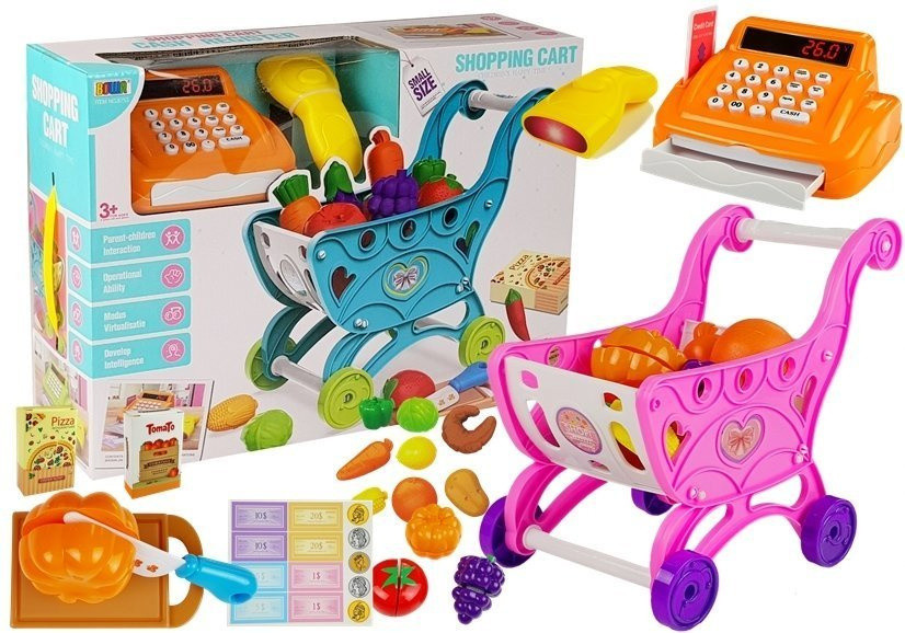Mini Market pénztárgéppel és kiegészítőkkel   A bolti játék az egyik legnépszerűbb szórakozás minden korosztály számára. Ez az időtöltési forma lehetővé teszi a számolás és az alkudozás megtanulását. A játék pénztárgép érdekes lehetőség arra, hogy a gyermek kellemes módon tanulja meg a matematika alapjait. A kocsival és kiegészítőkkel ellátott pénztárgép tökéletes kiegészítője lesz a még érdekesebb és jobb szórakozásnak, valamint színes és kellemes díszítést nyújt a gyerekszoba vagy a játszószoba dekorációjában. A bemutatott modell biztonságos játék, mivel a játék pénztárgép gyártásához a legmagasabb minőségű, minden szükséges tanúsítvánnyal rendelkező anyagokat használták fel. A játék dizájnja nagyon modern. A pénztárgép áramvonalas formája tökéletesen harmonizál intenzív színével, amely minden bizonnyal vonzza a gyermek tekintetét, és játékra ösztönzi. A kihúzható fiók és a próbababa termékek: termékszkenner és -kijelző csak egy a berendezés számos előnye közül. A készlet tartalma: - bevásárlókocsi - élelmiszer-kiegészítők: paradicsom, sárgarépa, citrom, narancs, kukorica, croissant, káposzta, tök - termékleolvasó próbababa, - pénztárgép, vágódeszka, kés - kartonpapír érmék és bankjegyek. A különféle kiegészítők lehetővé teszik a gyermek számára, hogy széles választékkal hozza létre saját üzletét. Fejlesztheti képzelőerejét és pontosan eljátszhatja a pénztáros szerepét. A kis eladó készlete egy dekoratív, színes dobozba van csomagolva, így tökéletes ajándék. A pénztárgép működtetéséhez három AA elem szükséges, amelyek nem részei a készletnek.   A pénztáros készletben található elemek méretei: - pénztárgép: 14 cm x 11 cm x 7 cm - bevásárlókocsi: kb. 28 cm x 24,5 cm x 18 cm   A csomag mérete: 40 cm x 28 cm x 12 cm