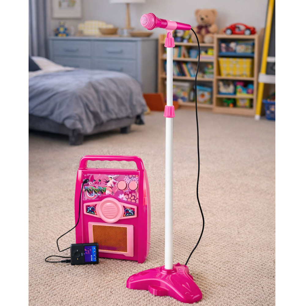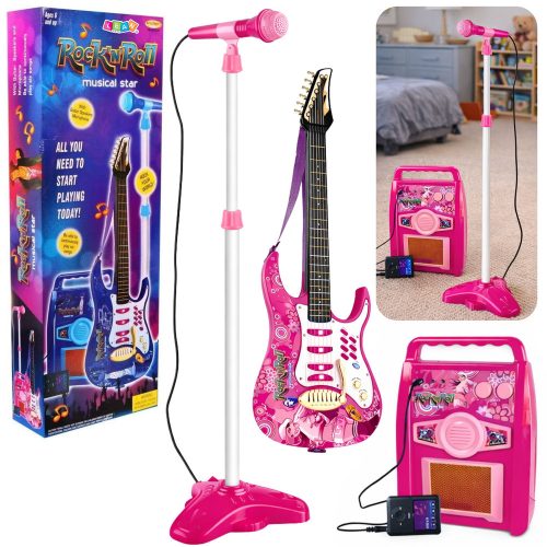 Rózsaszín elektromos gitár mikrofonnal és erősítővelA sziklakarom játék kiváló minőségű, kék árnyalatú anyagból készült. A gitár testét egy érdekes grafikus matrica és nyolc gomb díszíti. Többek között ezekkel a gombokkal lehet be- és kikapcsolni a gitárt, valamint dalokat és gitárhangokat váltani. A hangszer műanyag modellje fém, érintésérzékeny húrokkal van felszerelve, amelyek az igazi gitárokban található húrokra emlékeztetnek. A sziklajátékhoz mellékelt lányos pánt megkönnyíti a kis gitáros számára a játékot - többé nem kell aggódnia amiatt, hogy a játék leesik játék közben.Mit talál a sztárod a készletben?- gitár,- 6 fém húr,- választható hangszínek,- kar,- 6 demó dallam,- tempószabályozó,- hangerőszabályzó,- 4 villogó lámpa,- pánt,- mikrofon,- állvány,- erősítő.A mellékelt állvány megkönnyíti a mikrofon felszerelését a gyerek elé. Könnyen állítható a magassága, amely 65 cm és 109 cm között lehet. A játék mikrofon a gitárhoz csatlakoztatva a gyermek énekhangját a beépített hangszóróra továbbítja, ahonnan az aztán visszajátszik. Az erősítő, akárcsak a gitár, beépített hangerőszabályzóval, valamint három különböző porttal rendelkezik: a mikrofonhoz, a gitárhoz és az MP3-lejátszóhoz. Gitár méretei: 72 cm x 24 cm x 4 cm Doboz méretei: 73 cm x 26 cm x 11 cm A gyermekgitár 4 db AA 1,5 V-os elemmel működik, amelyek nem részei a hangszernek. 6 év feletti gyermekek számára alkalmas. A készlet minden eleme CE tanúsítvánnyal rendelkezik, ami igazolja a játék biztonságosságát. A játék többszínű, színes dobozban van csomagolva.