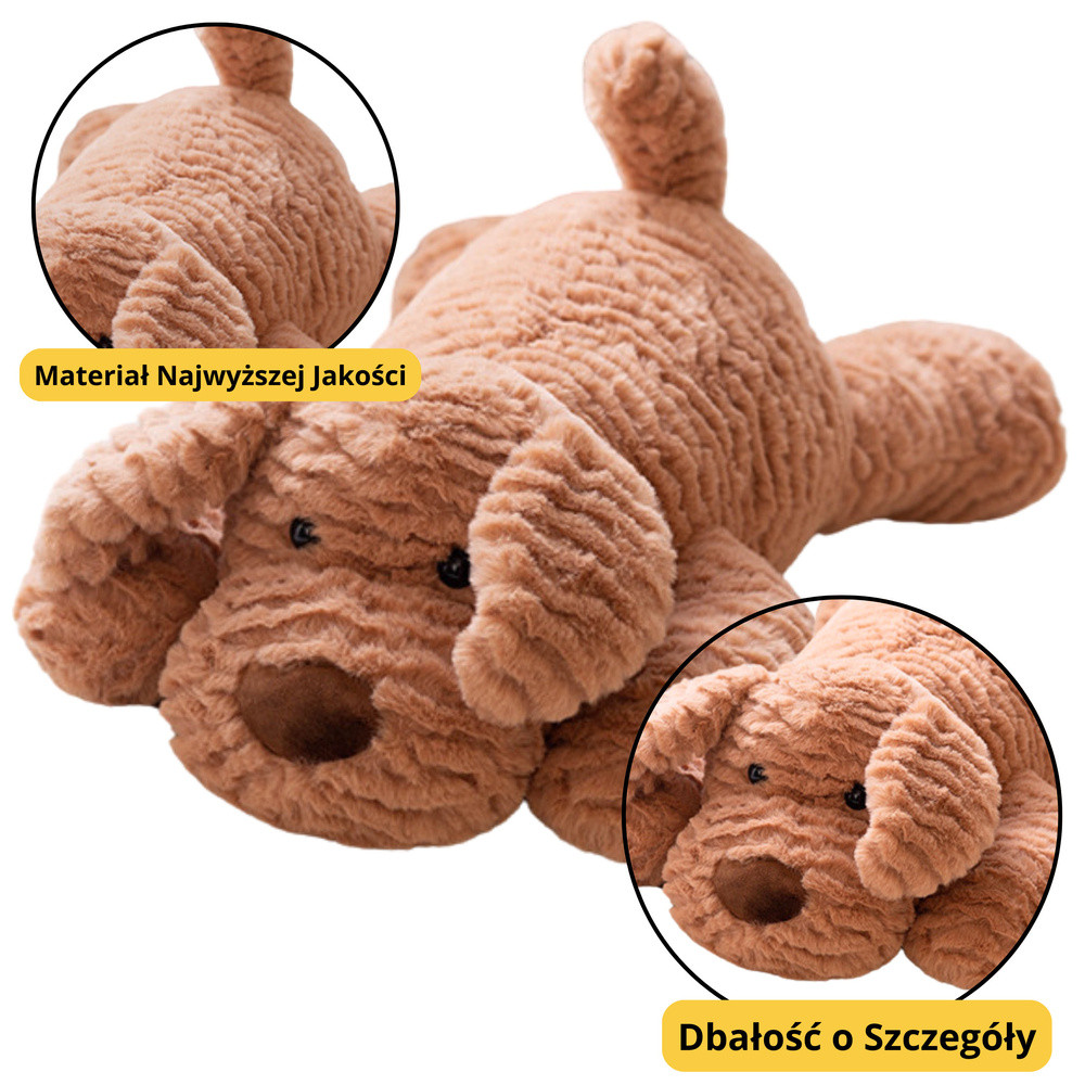 BÉZS ÖLELŐJÁTÉK PLÜSS KUTYA A bézs plüsskutya egy bájos és kivételesen puha ölelnivaló játék, amely biztosan minden gyermek legjobb társává válik. Rendkívül finom és kellemes tapintású anyagból készült, a kutya kényelmet, melegséget és biztonságot nyújt a kisgyermekeknek ölelkezés, játék és alvás közben. Az anyag puha szerkezete ideálissá teszi simogatásra és ölelkezésre - gyerekek és felnőttek számára egyaránt. Kedves arca, nagy orra, hosszú, lógó fülei és bolyhos farka kivételesen barátságos és vicces megjelenést kölcsönöznek neki. Az állat kényelmes, természetes helyzetben fekszik, mancsai előre és hátra vannak nyújtva, ami igazi kiskutyára emlékeztet. Ez a forma serkenti a gyermekek fantáziáját, arra ösztönzi őket, hogy jeleneteket és történeteket alkossanak a kutyával kapcsolatban, ami támogatja a legkisebbek érzelmi fejlődését és kreativitását. Kompakt méreteinek köszönhetően a plüssállat tökéletes otthon és utazáskor is - könnyen elfér egy hátizsákban, bőröndben, gyerektáskában vagy akár egy gyerekágyban is. Könnyű és elég praktikus ahhoz, hogy a gyermek mindig magával vigye. Tökéletes társ elalváshoz, közös kalandokhoz és mindennapi rituálékhoz, amely közelség és biztonságérzetet ad. Remekül illik ajándékba is bármilyen alkalomra. SPECIFIKÁCIÓ: Méretek: kb. 30 x 18 x 11 cm Anyag: puha plüss, biztonságos gyermekek számára Szín: bézs SZETT TARTALMA: Plüss kutya – bézs
