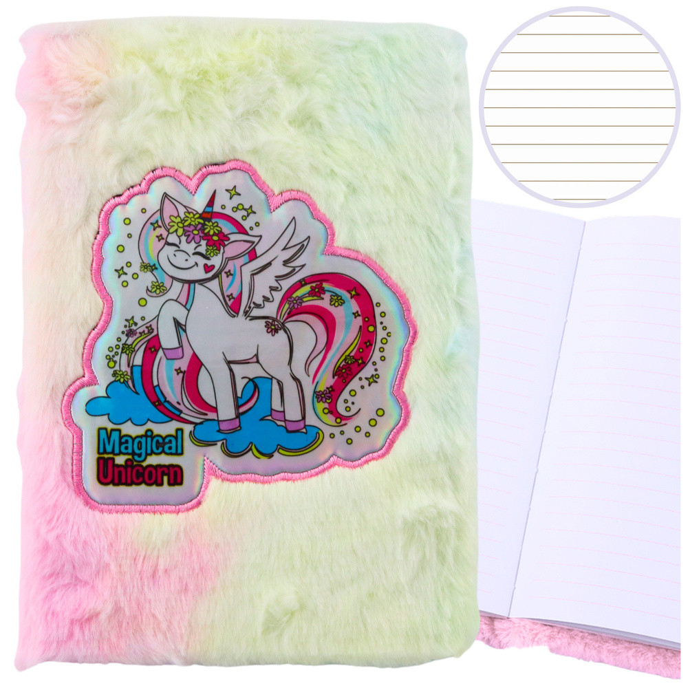 Plüss szőrmével bélelt jegyzetfüzet színes unikornis mintával, A5