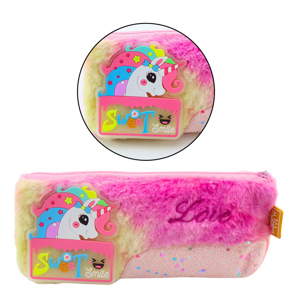 Egyszarvú plüss tolltartó fényes rózsaszín unikornis elemekkel