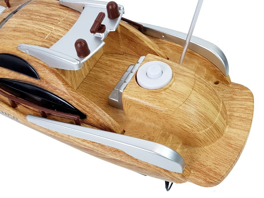 RC MOTORCSÓNAK TÁVIRÁNYÍTÁSÚ 40M A távirányítós játékok rengeteg izgalmat nyújtanak. A távirányítós motorcsónak nagyszerű választás minden vízi verseny rajongó számára. Ideális játék nyaralási kirándulásokhoz a vízhez, medencéhez vagy tóhoz, garantálva az adrenalinnal teli kalandokat és a felejthetetlen verseny pillanatokat. A modell egyetlen műanyag darabból készült, ami teljes tömörséget biztosít és megvédi a víz bejutását a szerkezetbe. Ennek köszönhetően élvezheti a sima és biztonságos szórakozást a vízen anélkül, hogy aggódnia kellene a sérülések vagy meghibásodások miatt. A hajó két hatékony motorral van felszerelve, amelyek lehetővé teszik az előre-hátra mozgást, valamint a dinamikus fordulásokat. A kormánylapát alakú távirányító realizmust kölcsönöz, és még jobban bevonja a gyermeket a játékba. A vezérlő 27 MHz frekvencián működik, a mellékelt antenna pedig felerősíti a jelet, lehetővé téve a hajó teljes irányítását nagyobb távolságokból is. A nagy irányítási tartománynak (kb. 40 m) köszönhetően a gyermek szabadon manőverezheti a hajót a vízen, versenyeket szervezhet, elkerülheti az akadályokat és látványos fordulatokat hajthat végre. A játék tökéletesen fejleszti a kéz-szem koordinációt, a reflexeket és a precíz irányítás képességét. A hajó nagyszerű ajándékötlet minden távirányítású járművek és vízi kalandok rajongója számára. Dinamikus kialakításának, masszív felépítésének és realisztikus funkcióinak köszönhetően a motorcsónakkal való játék rengeteg érzelmet nyújt mind a gyermekek, mind a felnőttek számára. SPECIFIKÁCIÓ: A játék célja: koordináció, reflexek és kézügyesség fejlesztése Szín: barna Vezérlési frekvencia: 27 MHz Távirányító hatótávolsága: kb. 40 m Motor: két nagy teljesítményű hajtás, amely lehetővé teszi a dinamikus manővereket Hajó tápellátása: 7,2 V 700 mAh akkumulátor Távirányító tápellátása: 9 V-os elem Biztonság: lezárt konstrukció, amely megakadályozza a víz bejutását Hajó méretei: 38 cm x 13 cm x 14 cm Távirányító méretei: átmérő 16 cm, magasság 5 cm Csomag méretei: 51 cm x 19 cm x 15 cm A SZETT TARTALMA: Távirányítású motorcsónak Kormány alakú távirányító Jelerősítő antenna