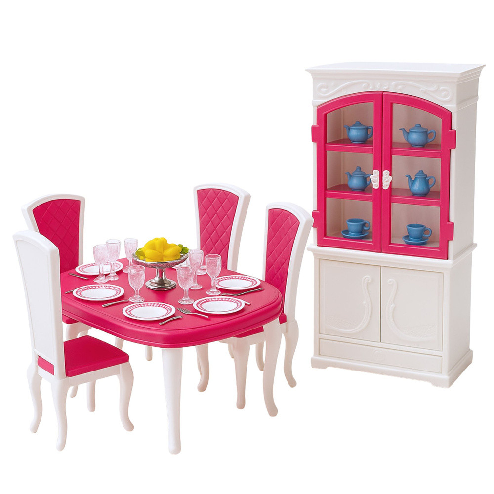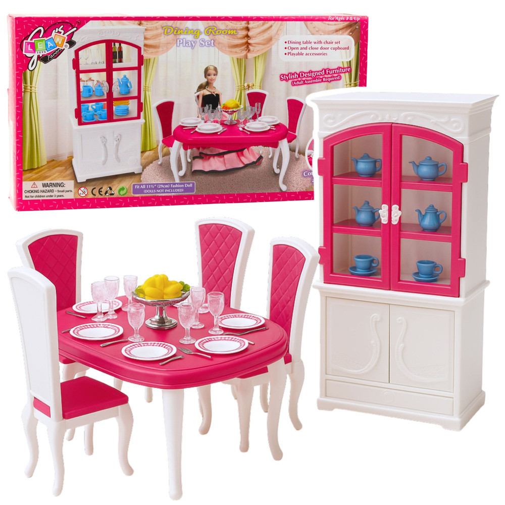 Baba étkezőgarnitúra: asztal, székek, tálalószekrény, tányérok