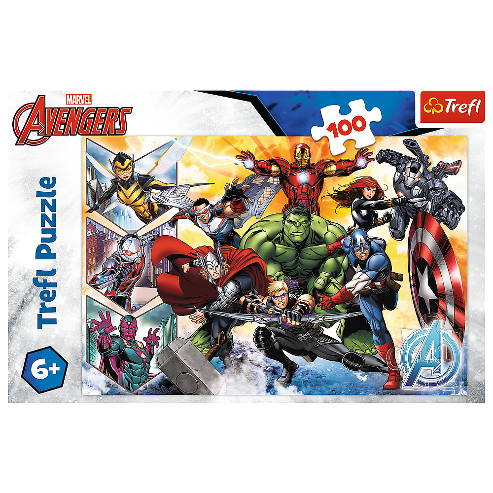 Puzzle - "100" - A Bosszúállók Ereje Trefl 16431 Egy 100 darabos puzzle, amelyet a Marvel-filmek, különösen a Bosszúállók film rajongóinak terveztek. A puzzle összerakása után egy 410x275 mm méretű kép jön létre. A termék kiváló minőségű anyagokból készült, speciális, fényvisszaverő, kalanderezett papír felhasználásával, ami megkönnyíti az összeszerelést. A terméket Lengyelországban gyártották, és a gyártás során környezetbarát anyagokat használtak fel.