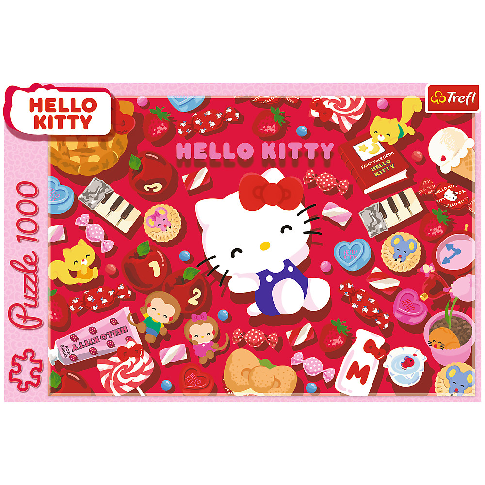 Puzzle - "1000" - Hello Kitty Trefl 10920 darabos Hello Kitty puzzle, 1000 darabból áll, melyek a mese azonos című édes hősnőjét ábrázolják. Elrendezésük után egy 683x480 mm méretű kép jön létre. A termék Lengyelországban készült, kiváló minőségű, környezetbarát anyagok felhasználásával. A speciális kalanderezett papír visszaveri a fényt, ami megkönnyíti az összeszerelést.