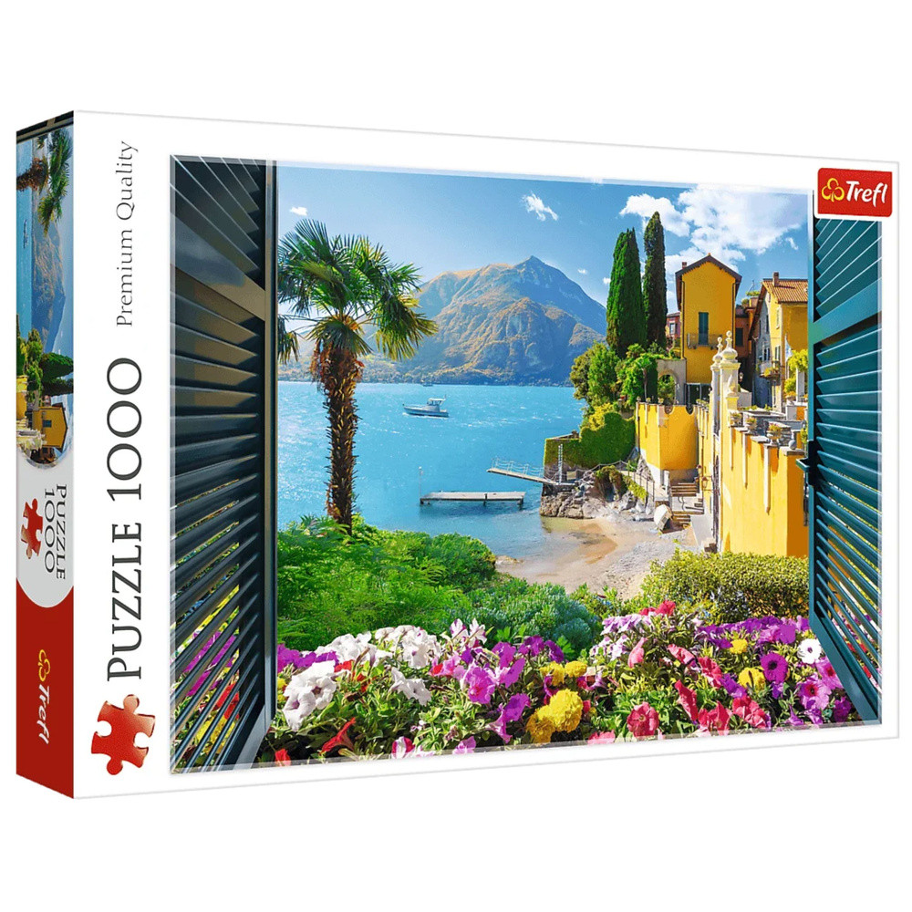 1000 darabos kirakó - Comói-tó kilátás Trefl 10951 Az 1000 darabos Comói-tó kilátás kirakó egy gyönyörű kilátást ábrázol egy ablakból az olaszországi tóra. Összerakva a kirakó egy 683 x 480 mm-es képet alkot. A termék Lengyelországban készült, kiváló minőségű, környezetbarát anyagok felhasználásával. A speciális kalanderezett papír visszaveri a fényt, így az összeszerelés könnyebb.