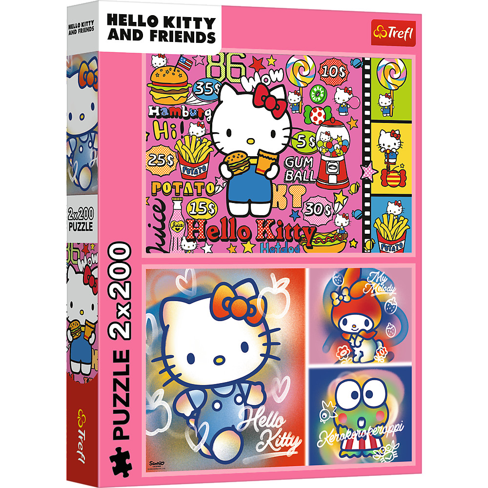 Kirakó - 2x200 - Hello Kitty és barátai - Hello Kitty 13336 A 2x200-as kirakó két 200 darabos kirakó egy csomagban! A Hello Kitty és barátai egy színes kollázsokat ábrázoló kirakó, amely a Hello Kitty mesére utal. Minden kirakóval egy 410x275 mm méretű képet alkothatsz. A termék Lengyelországban készült, környezettudatosan és kiváló minőségű, FSC tanúsítvánnyal rendelkező anyagok felhasználásával.