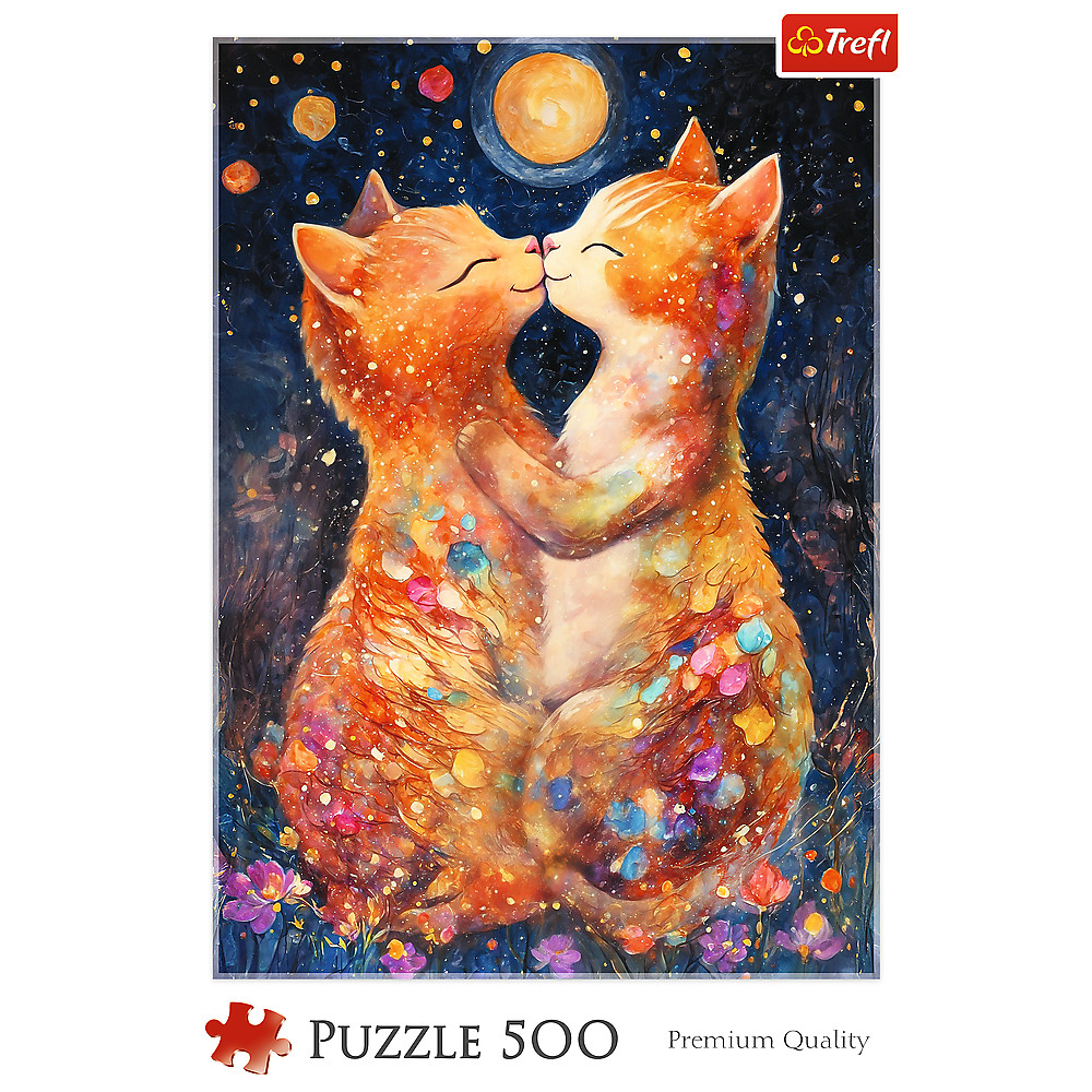 Puzzle – 500 – Holdfényes csók Trefl 37546 A Holdfényes csók kirakó 500 darabból áll, és két csókolózó kiscicát ábrázol. A kész kirakó mérete 480x340 mm. A termék Lengyelországban készült, kiváló minőségű anyagok felhasználásával, a környezeti fenntarthatóság figyelembevételével. Ezenkívül a kirakó speciális, fényvisszaverő, kalanderezett papírral van bevonva, így a kirakó könnyebb összeszerelést tesz lehetővé. 3 éves kortól alkalmas.