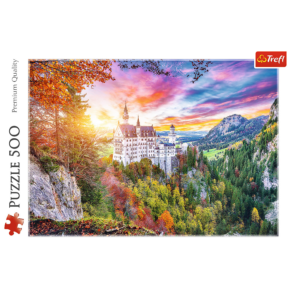 500 darabos kirakó. Neuschwanstein kastély látképe, Németország Trefl 37427 Egy 500 darabos kirakó, amely a németországi Neuschwanstein kastély látképét ábrázolja. Összerakás után egy 48x34 cm-es kép készül el. A kiváló minőséget, a színtelítettséget és az összeszerelés biztonságát a fényt visszaverő kalanderezett papír biztosítja, amelyet környezetbarát ételfestékekkel vontak be.